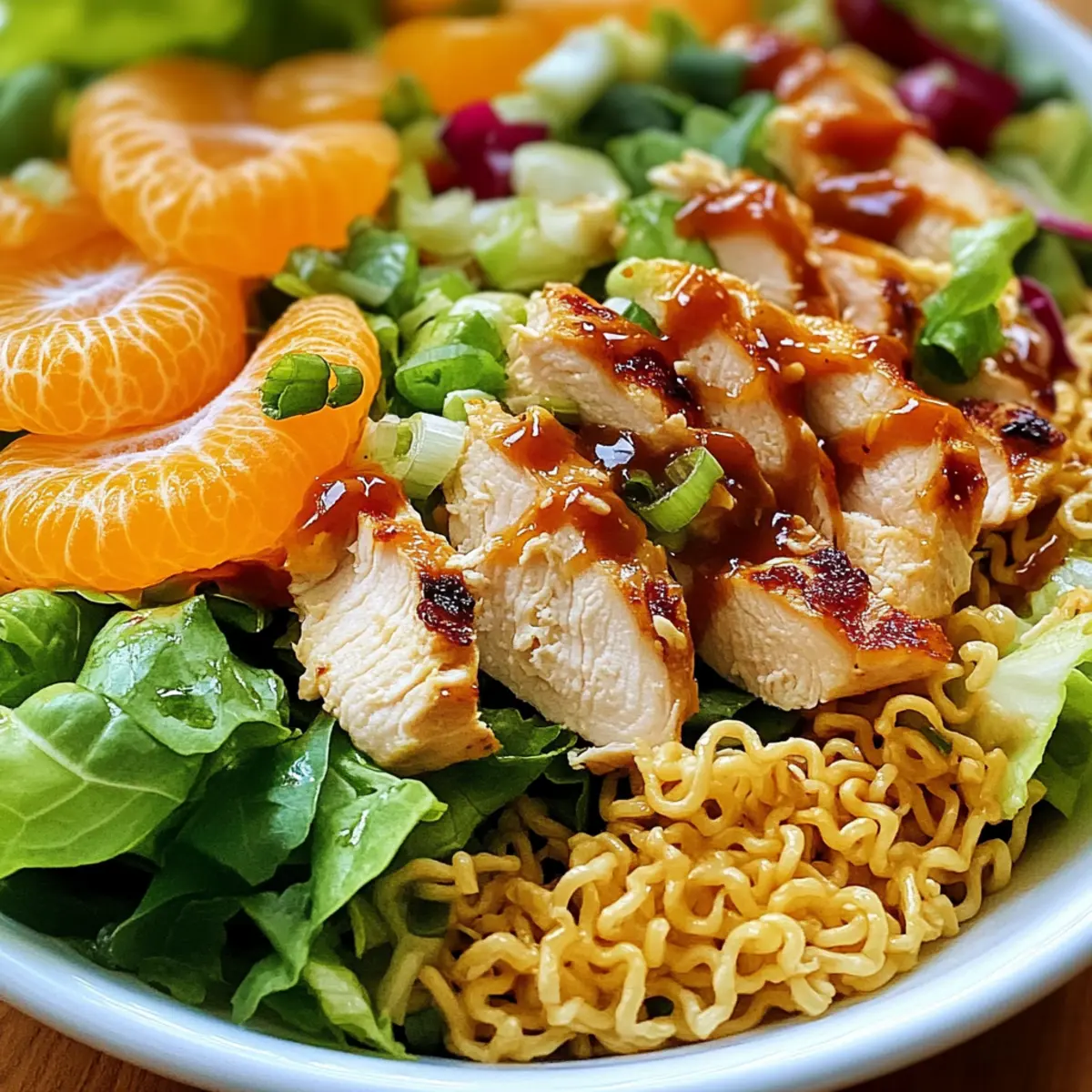 In a large mixing bowl, add the chopped lettuce, shredded cabbage, cooked chicken, mandarin oranges, and shredded carrots. Next, crush the ramen noodles gently — you want them crunchy! Toss all the ingredients lightly but thoroughly, allowing their colors and flavors to blend beautifully, creating a visual display that’s irresistible.