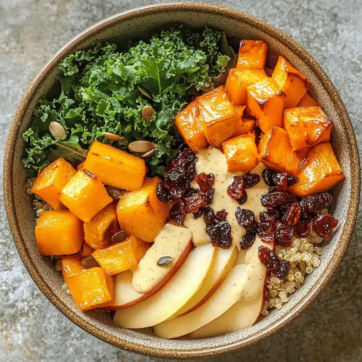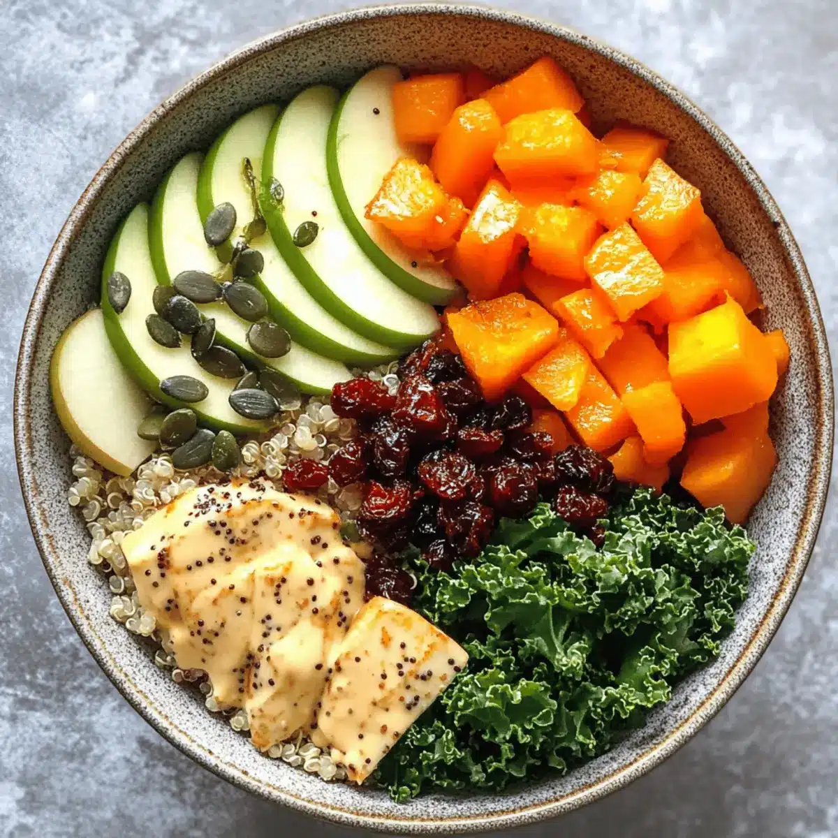 - Assemble your bowls with quinoa, butternut squash, kale, apple slices, cranberries, and pumpkin seeds.