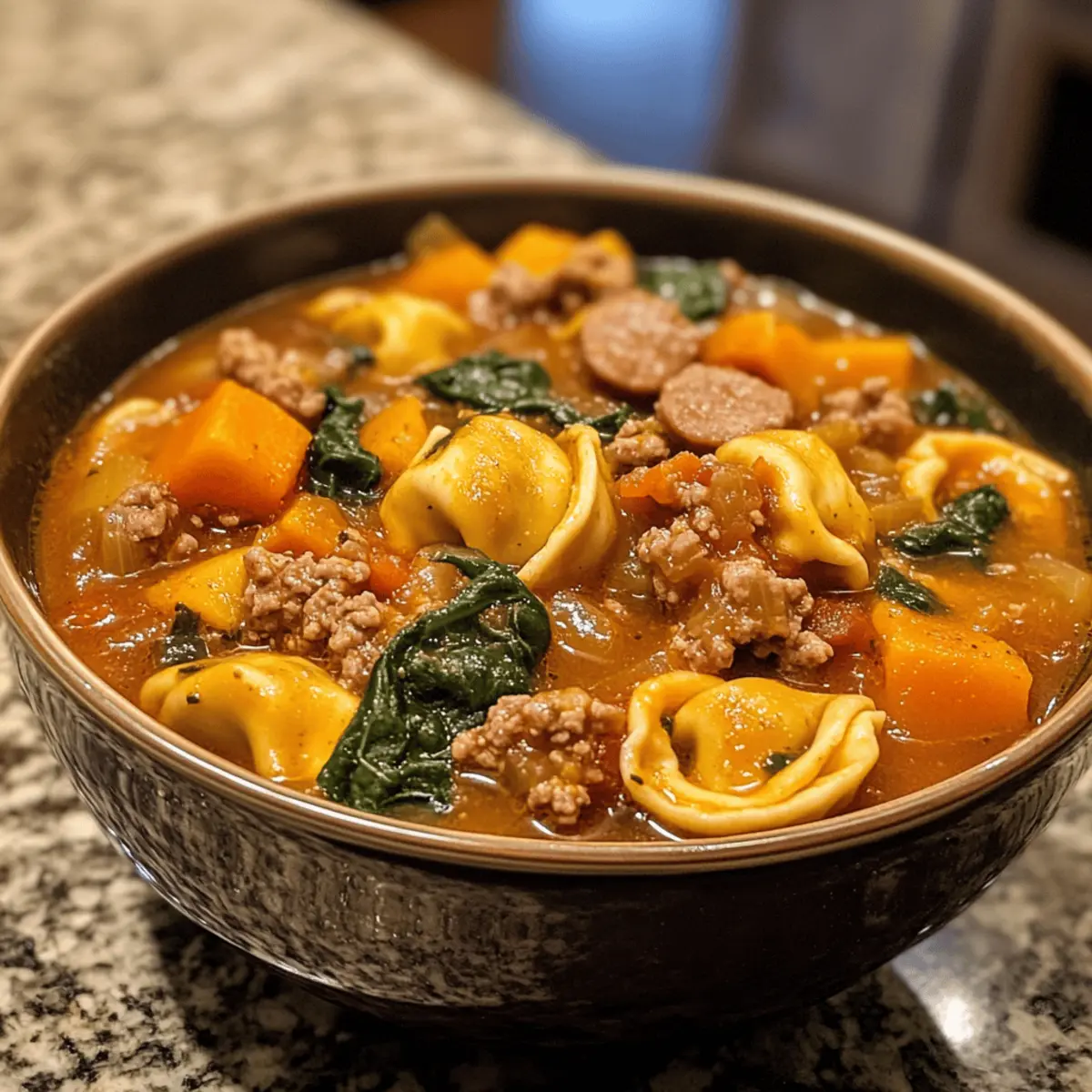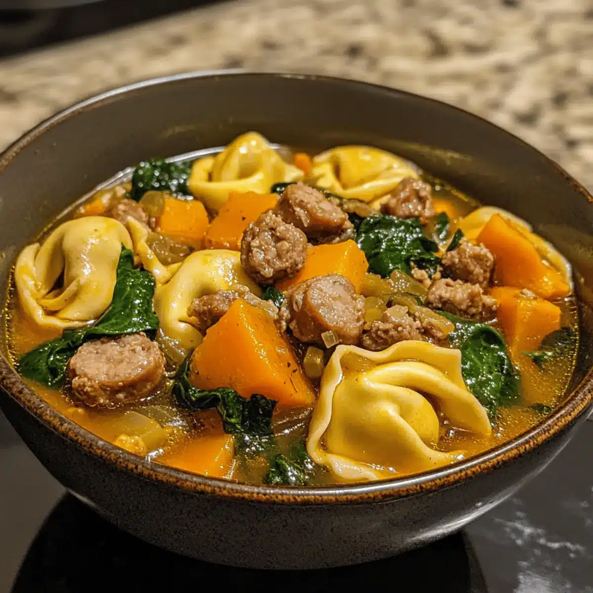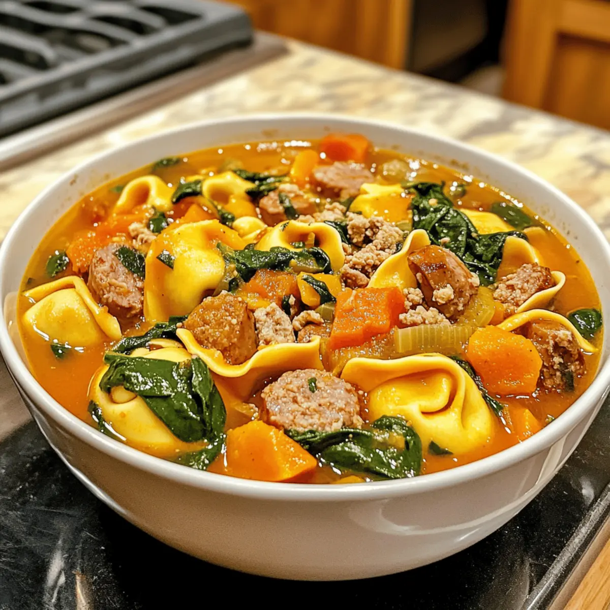 Comfort in a bowl: This Autumn Tortellini Soup is the ultimate embrace on a chilly evening, combining hearty sausage and cheesy tortellini.