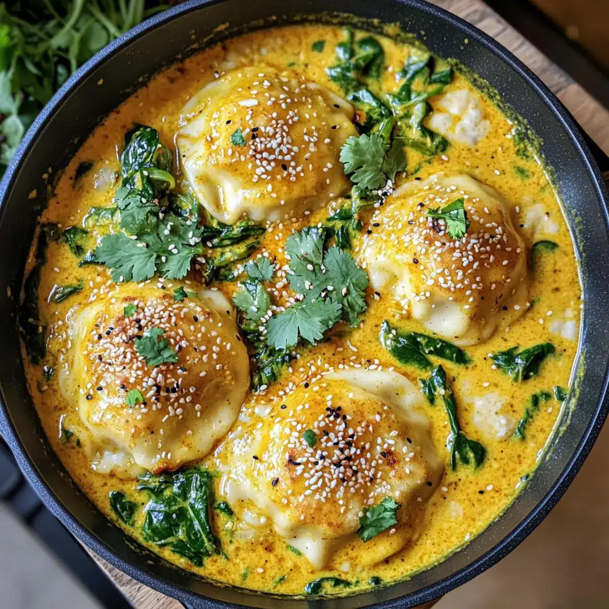 Gently place your frozen dumplings pinched-side down into the sauce, taking care to arrange them evenly across the dish. Spoon some of the broth over each dumpling to ensure they absorb all the rich flavors while baking. They will transform into tender, flavorful morsels that pair perfectly with the creamy curry sauce.