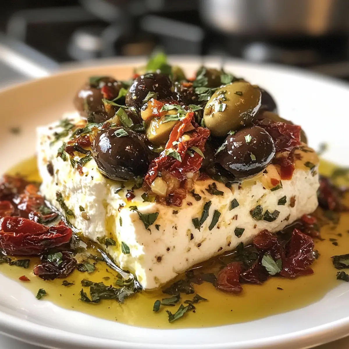 Preparing this Mediterranean Baked Feta Appetizer ahead of time is perfect for busy weeknights or entertaining! You can mix the topping (olives, sun-dried tomatoes, olive oil, and herbs) up to 24 hours in advance and refrigerate it in an airtight container. This will enhance the flavors while keeping the topping fresh. When you’re ready to serve, simply place the feta in your baking dish, add the topping, and bake as directed. For optimal texture, bake it immediately after topping, but if you want to prep everything, you can do so up to 3 days before and assemble the dish just before baking. This way, you’ll have a delicious, stress-free appetizer that’s just as delightful as if you made it on the spot!
