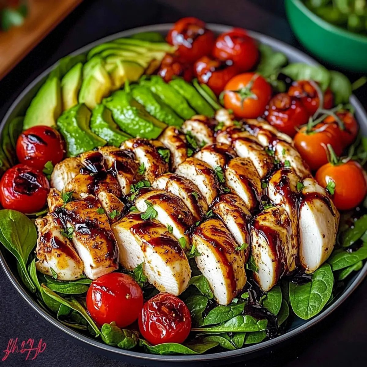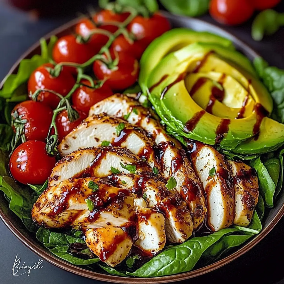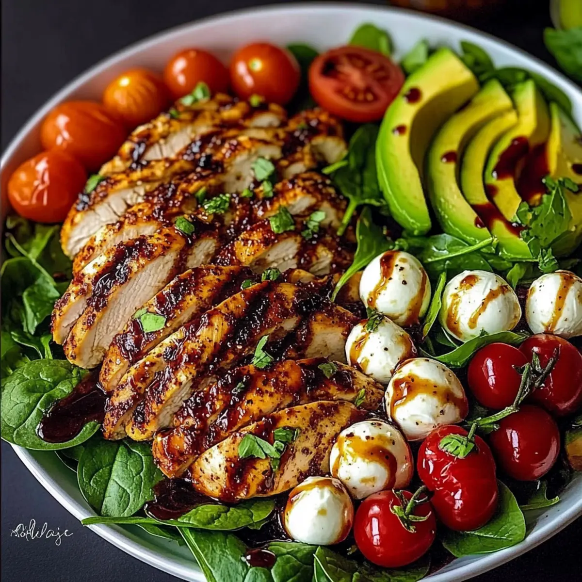 - In a large serving bowl, create a fresh bed of baby spinach. Neatly arrange the sliced baked chicken over the spinach, followed by the halved cherry tomatoes, sliced avocado, and drained mozzarella.