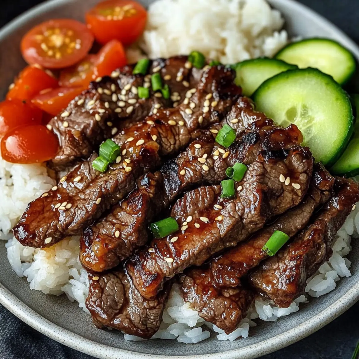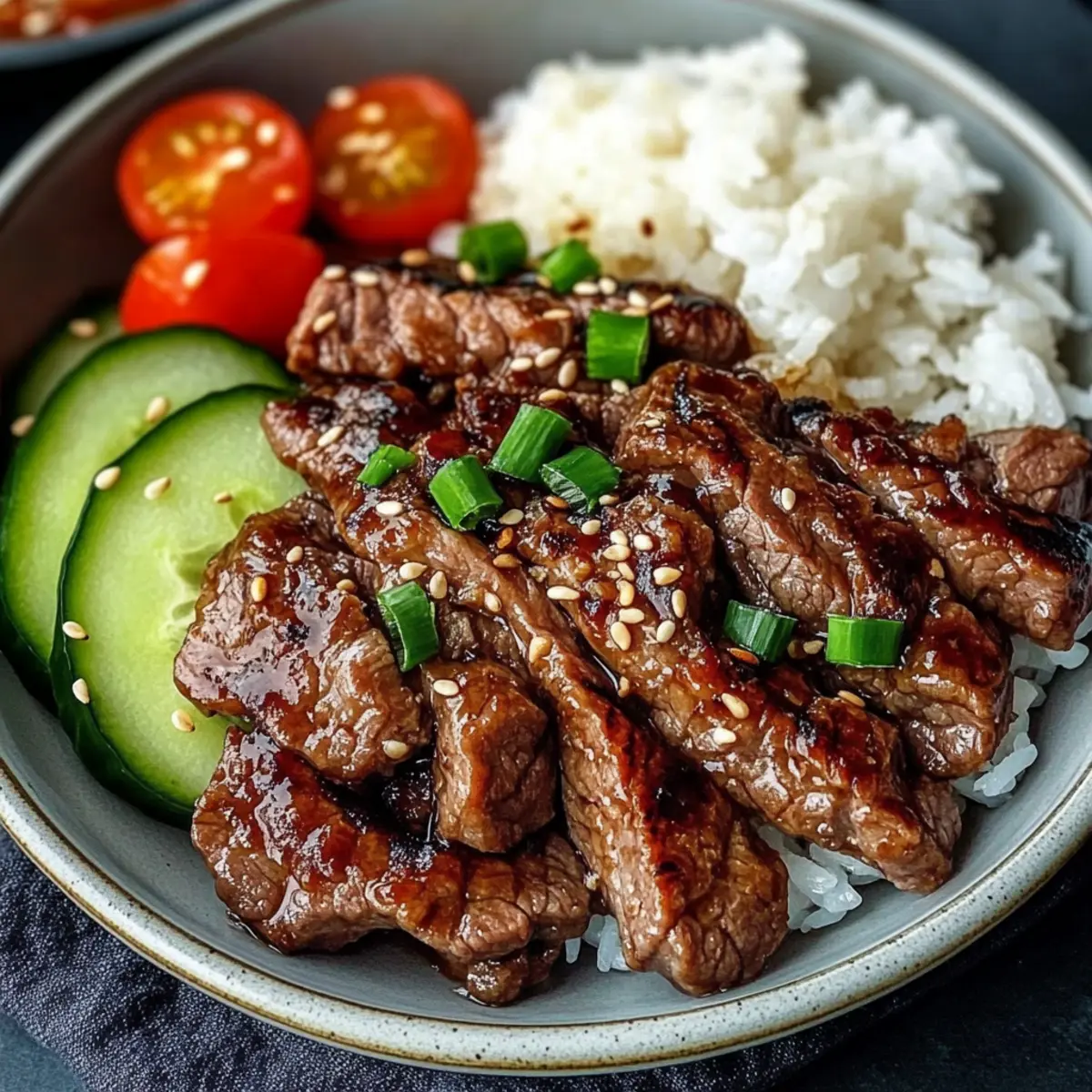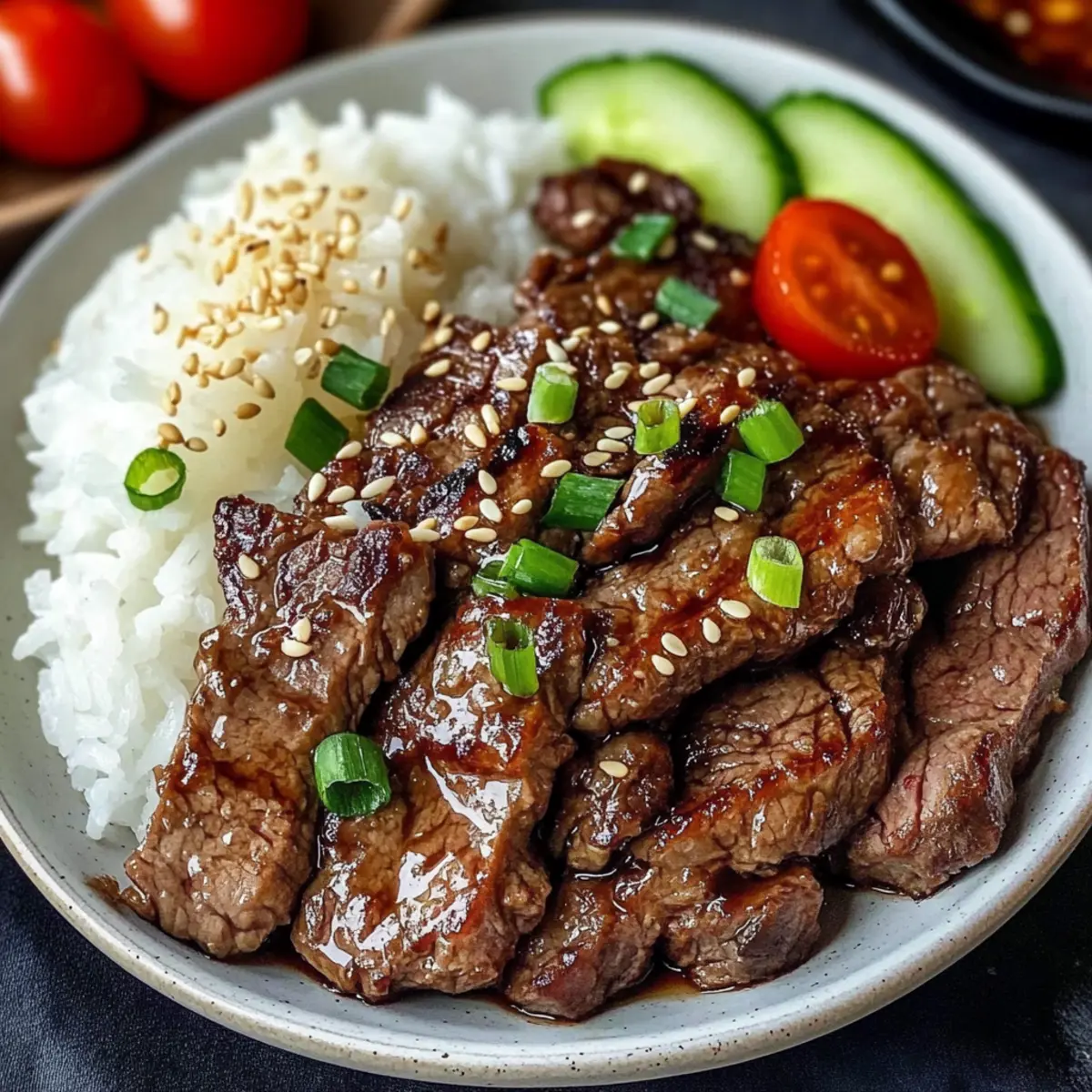 After cooking, remove the beef from the grill and let it rest for a minute. Plate the tender slices of Beef Yakiniku alongside a serving of fluffy boiled rice. For an added burst of freshness, garnish with sesame seeds and serve with chopped cucumber and tomato. This delightful presentation not only looks appealing but enhances the overall dining experience.
