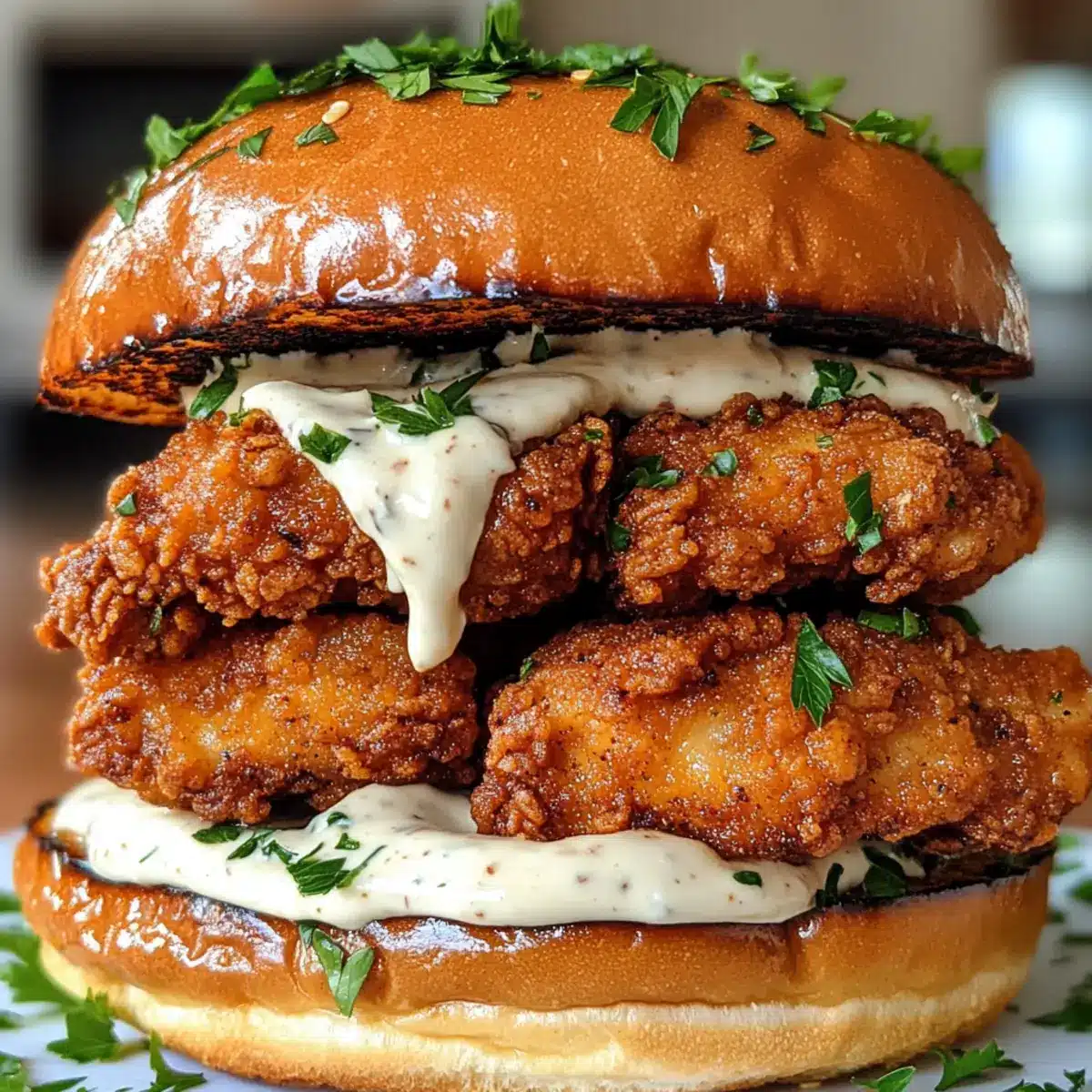 Once the chicken is fried to perfection, remove it and place it on a wire rack to cool slightly, preserving its crispiness. Toast the brioche buns lightly, then spread a generous amount of garlic aioli on both the top and bottom of each bun. Layer the crispy chicken on the bottom bun, adding any additional toppings like lettuce or pickles as you desire.