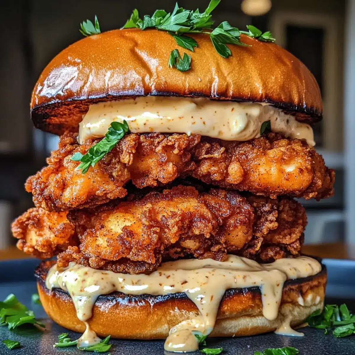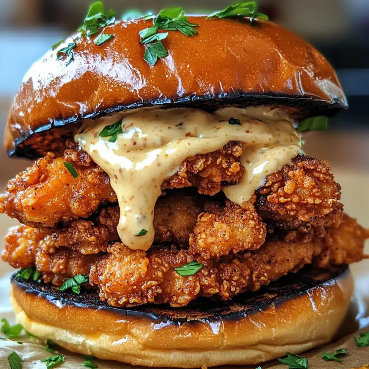 - Assemble the sandwich with garlic aioli spread on the buns and crispy chicken inside.
