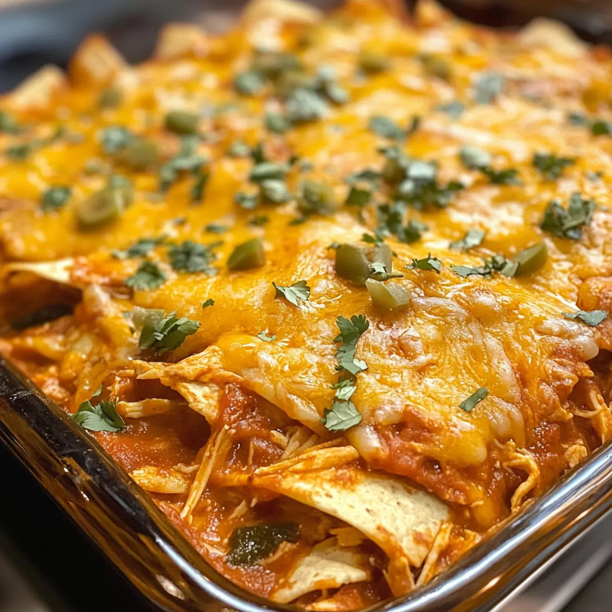 Comforting Flavors: This casserole bursts with zesty enchilada sauce and tender chicken, promising a delightful taste with every bite.