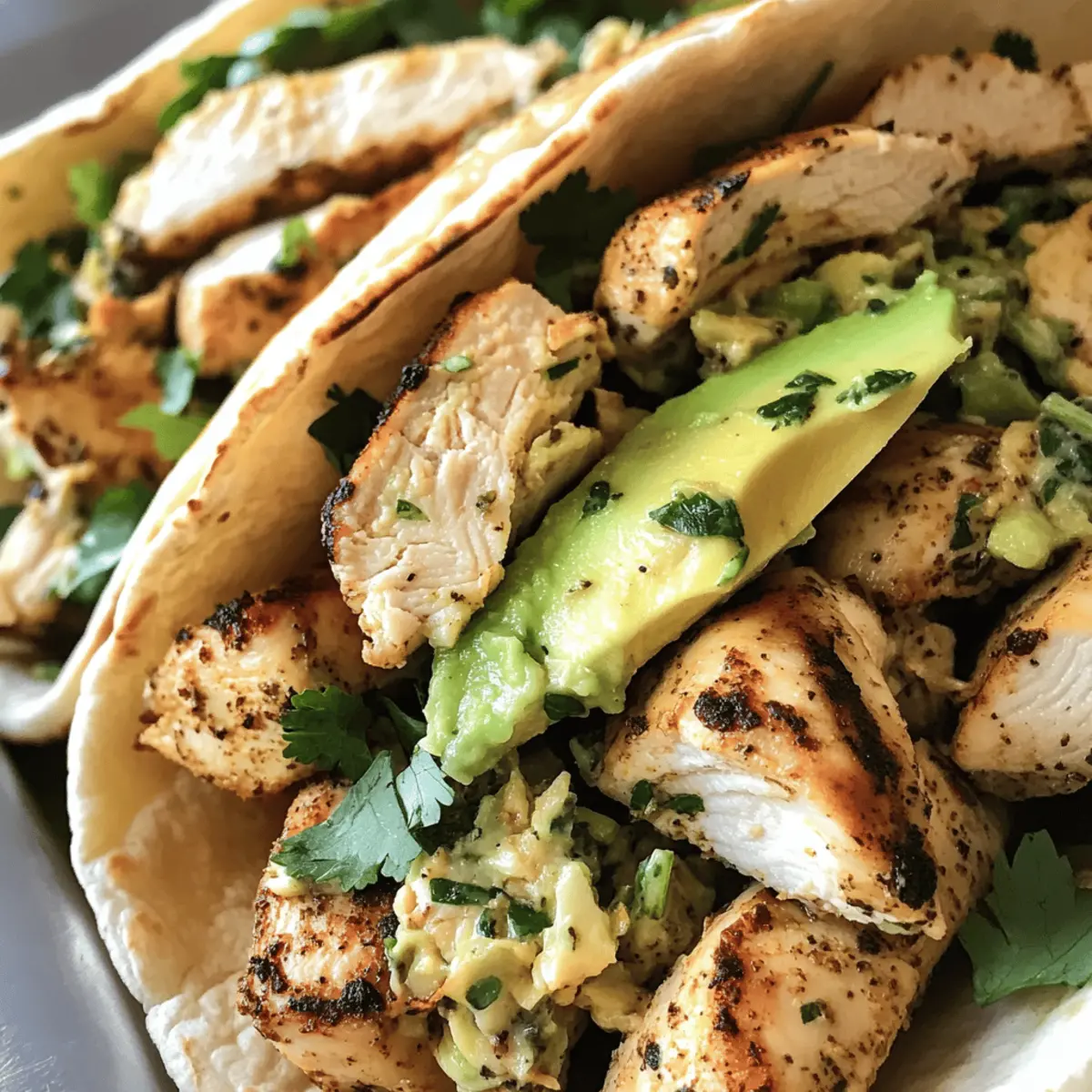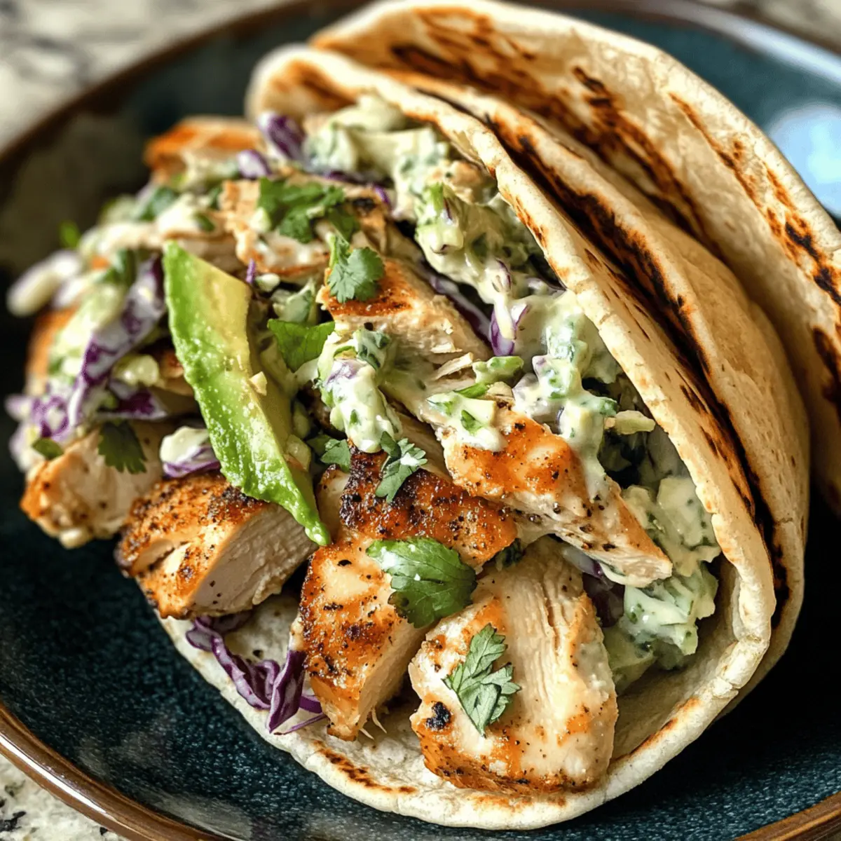 Reheating: Reheat the chicken in the microwave or oven until warmed through. Assemble the pitas with fresh slaw and avocado just before serving for optimal taste.