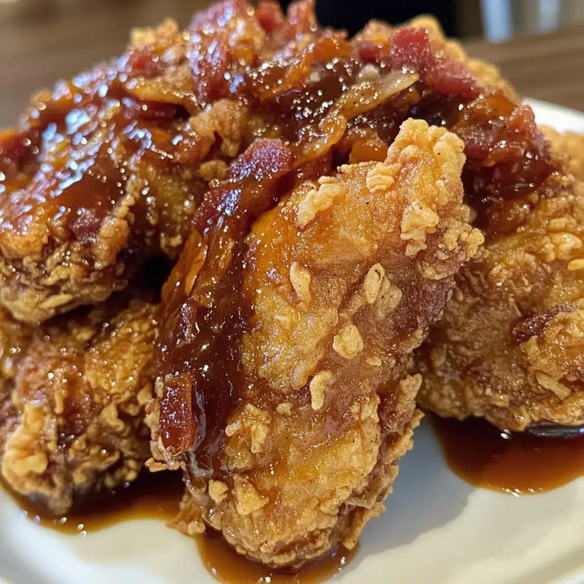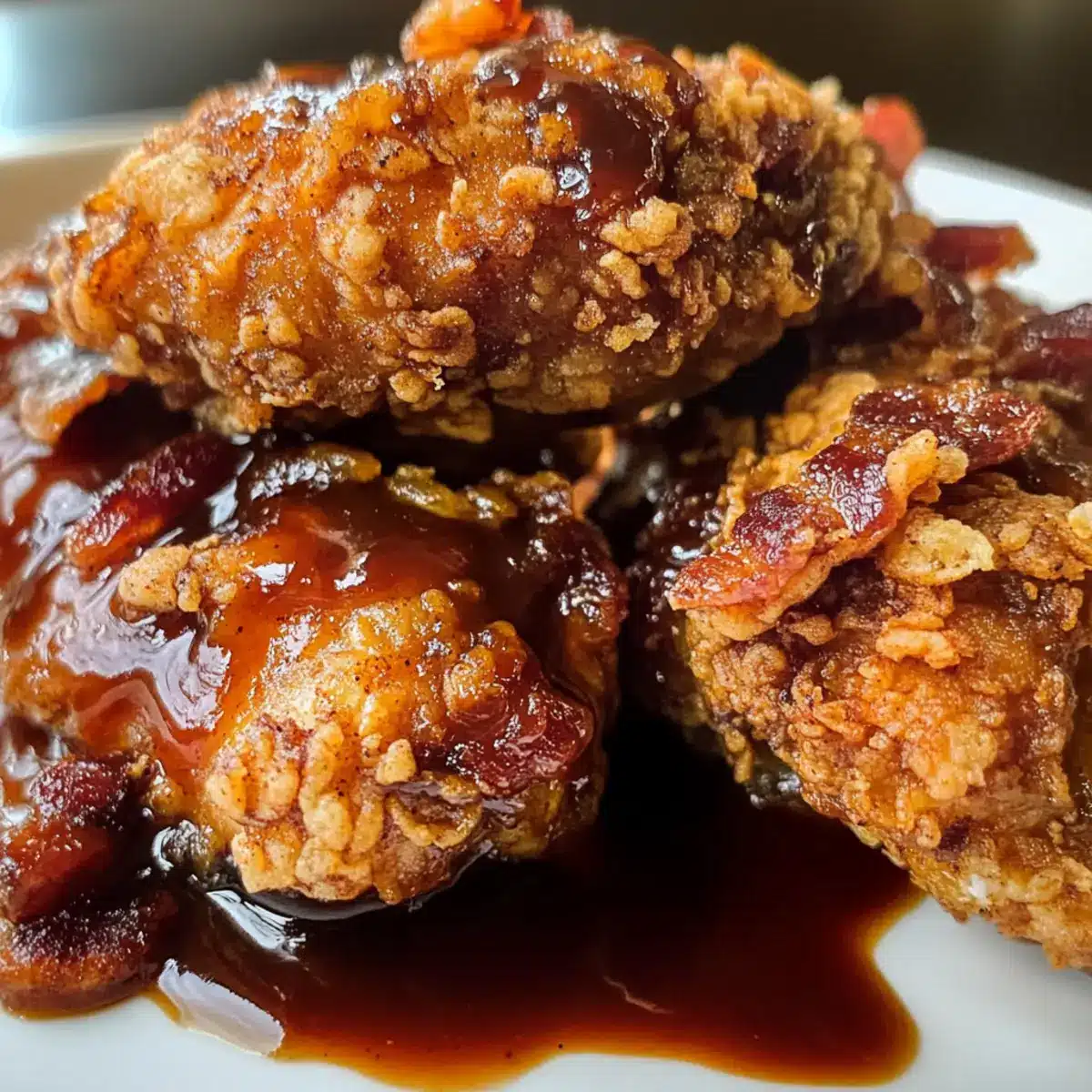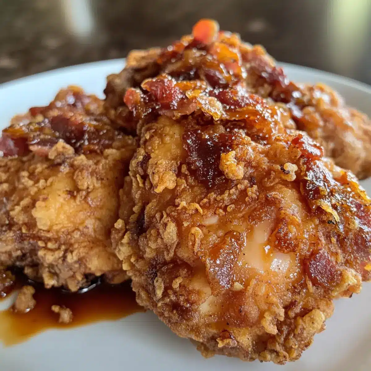 During the last minute of frying, sprinkle the crumbled bacon over each chicken breast, then drizzle a bit of barbecue sauce on top. This step allows it to caramelize slightly, enhancing the flavors as it melds with the crispy coating and juicy chicken.