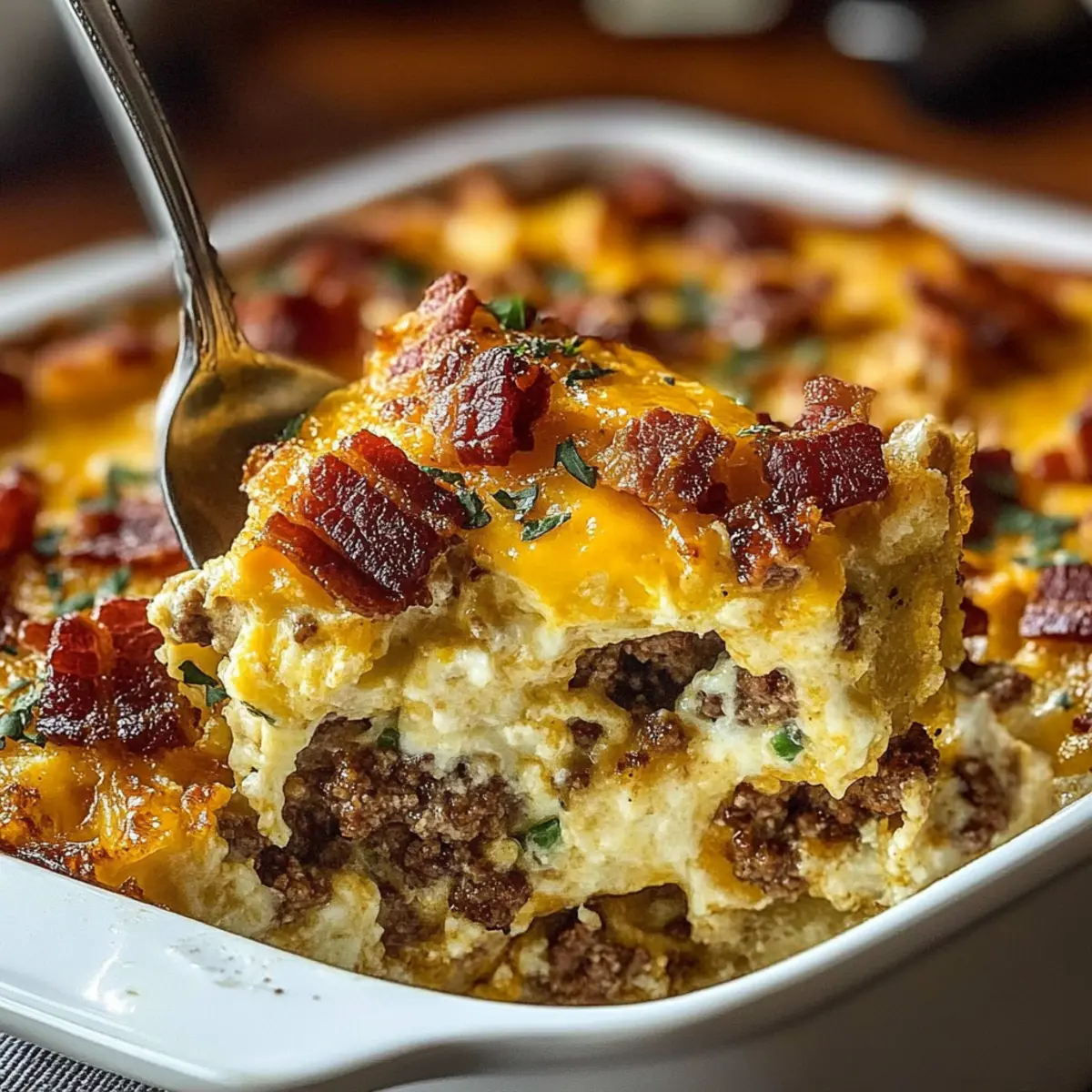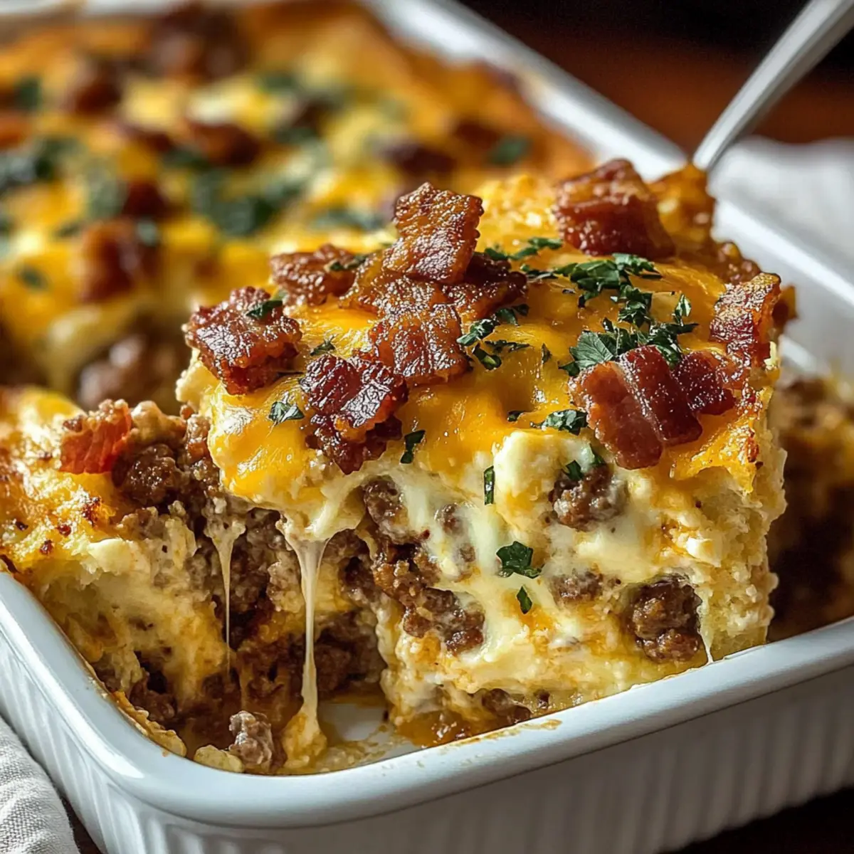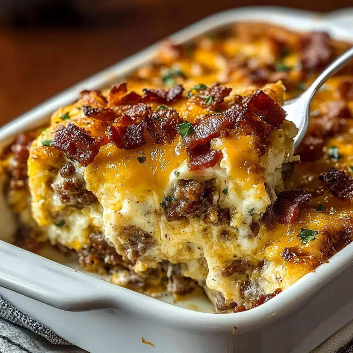 If your Crack Breakfast Casserole turns out soggy, it might be due to excess moisture in the hashbrowns or the creamy mixture. To avoid this, consider baking the frozen hashbrowns alone for 15 minutes before assembling. You can also ensure your cream cheese is well-blended to avoid lumps that might hold water. Lastly, be sure to let it cool before cutting for better slicing!