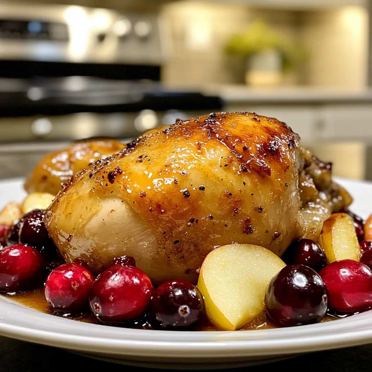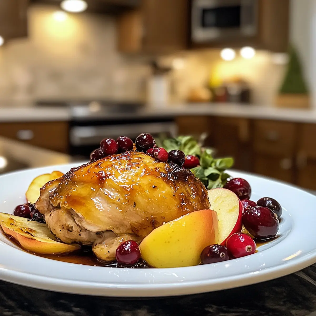 - Once the chicken is seared, remove the skillet from heat. Artfully arrange the sliced apples, fresh cranberries, and sprigs of rosemary around the chicken thighs in the skillet.