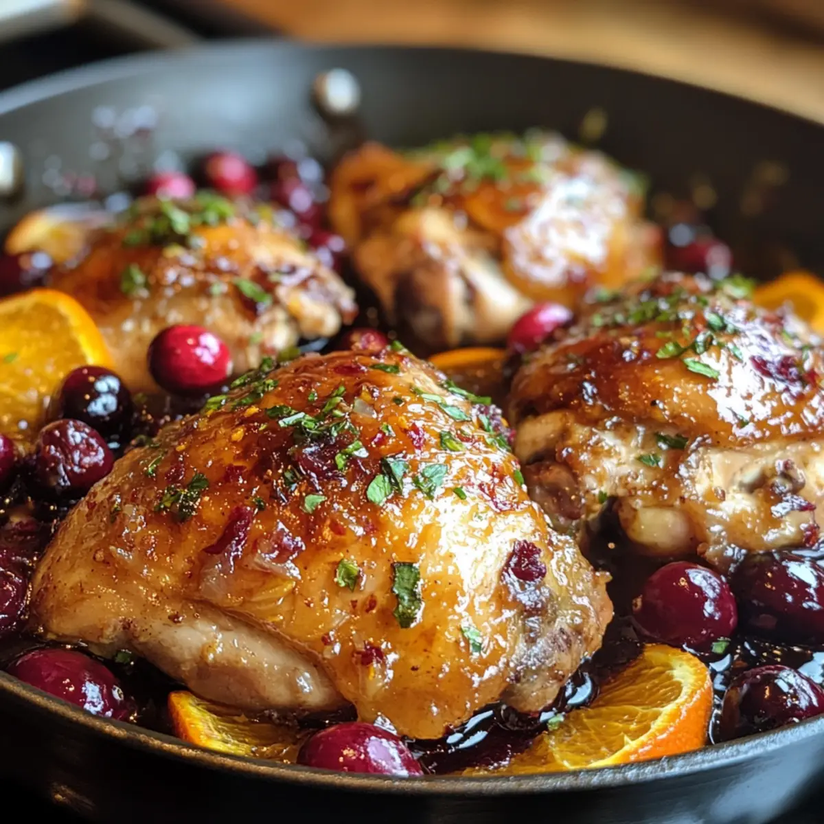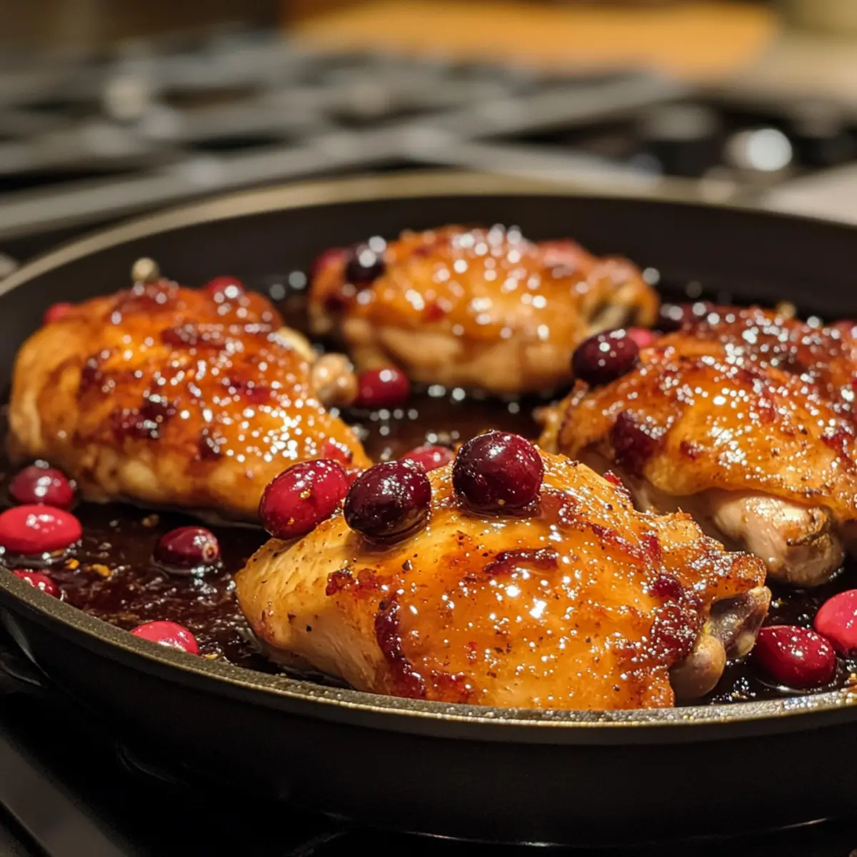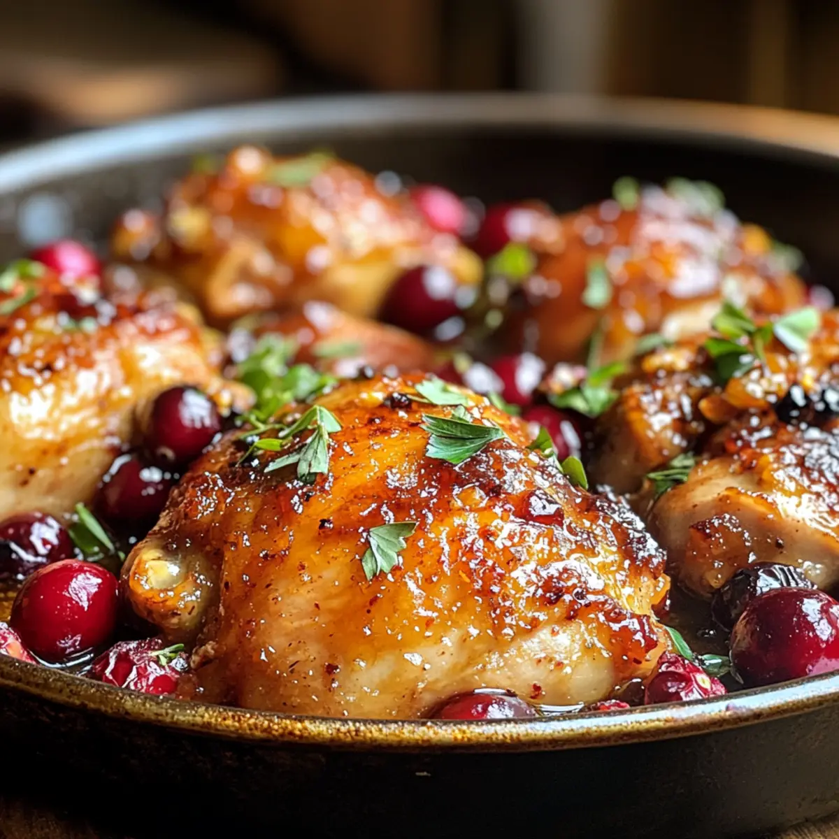 Transfer the marinated chicken thighs to a greased 8×8 baking pan. Pour any remaining marinade over the top, and scatter extra cranberries around the chicken for added flavor. Bake in the preheated oven for 25-30 minutes, or until the chicken reaches an internal temperature of 155°F and the juices run clear. You should see a golden glaze forming as it cooks.