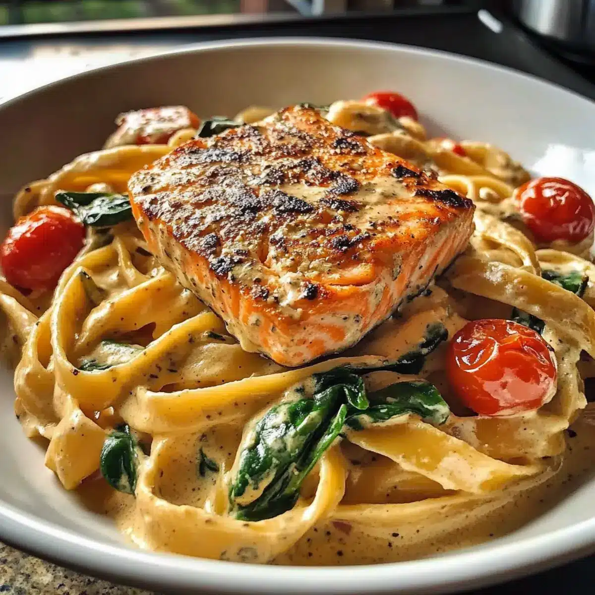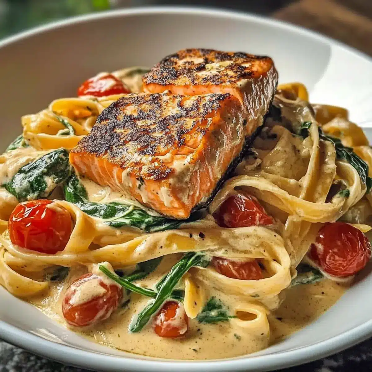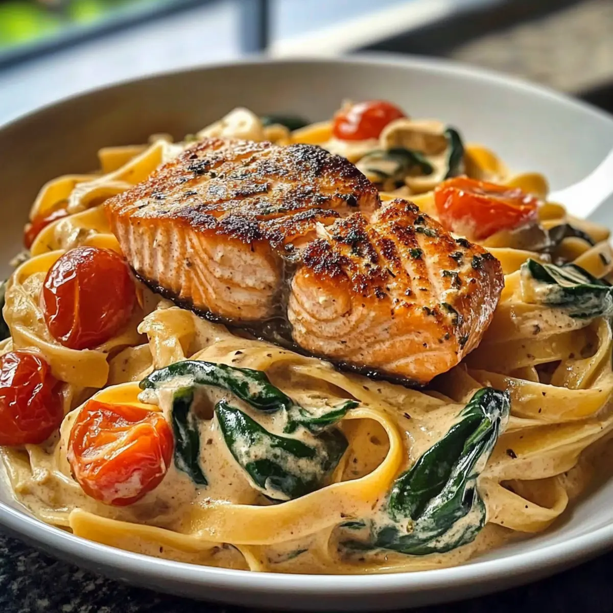 Decadent Flavor: You’ll love how the rich, garlicky cream sauce harmonizes with the tender salmon and juicy cherry tomatoes, creating a symphony of taste that truly elevates your meal.