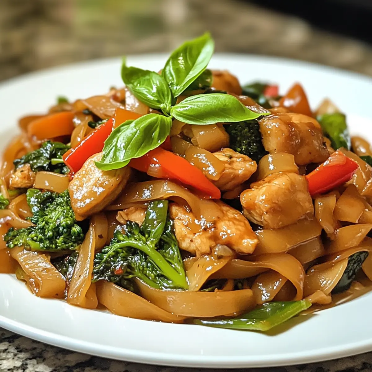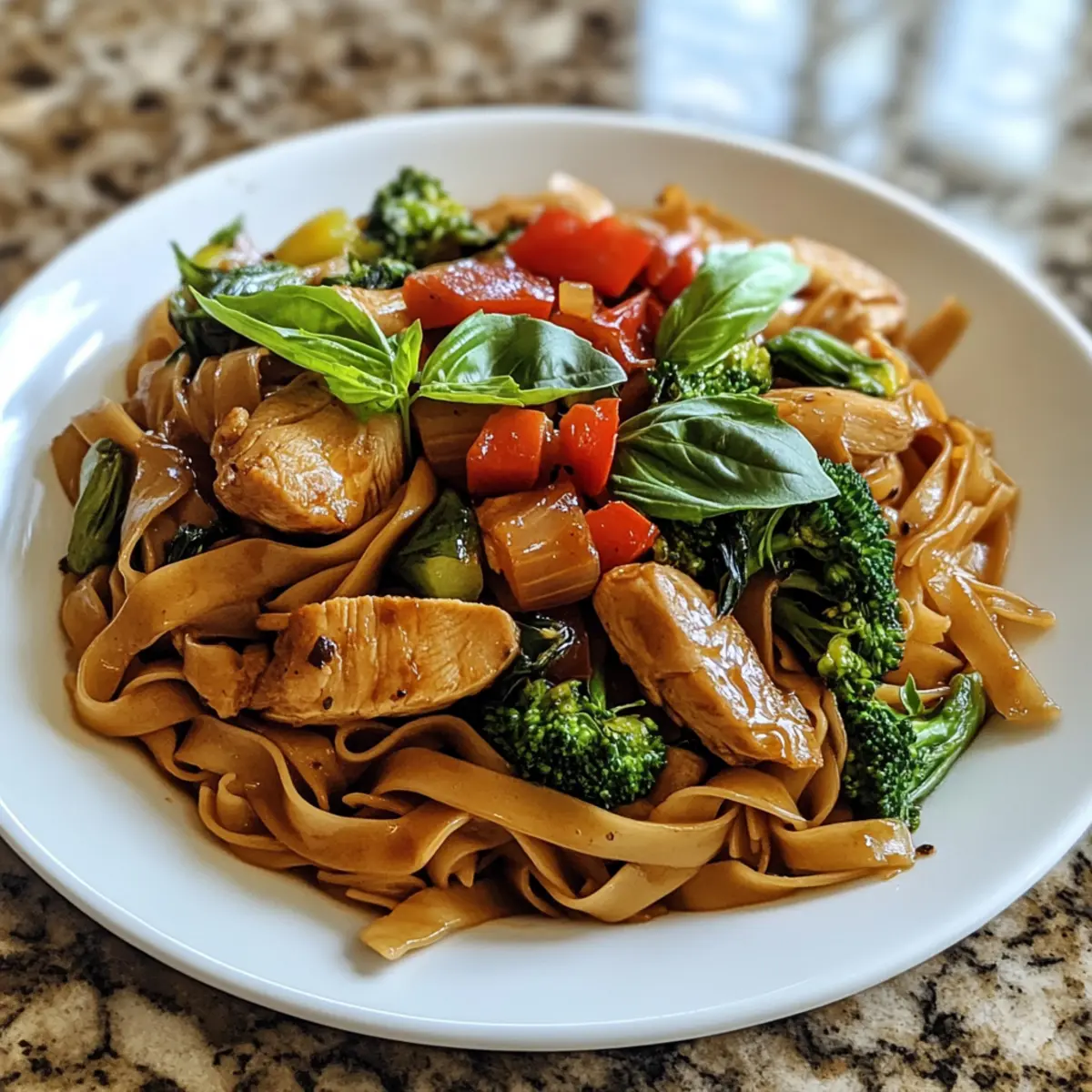 - Plate your Drunken Noodles while hot, garnishing with additional basil or chili if desired.