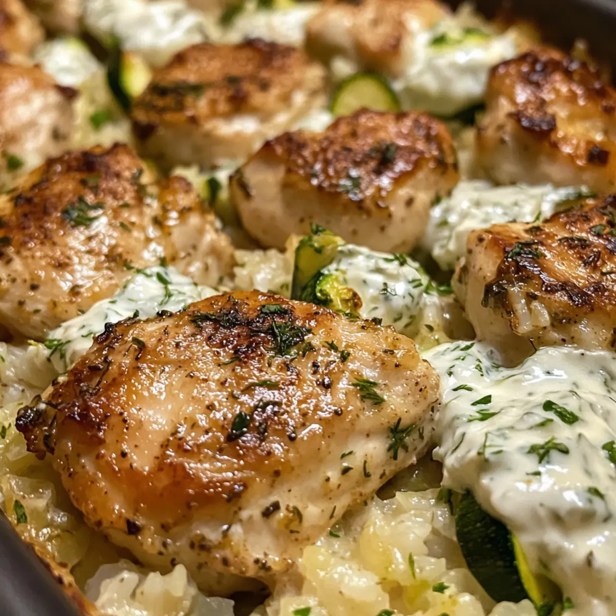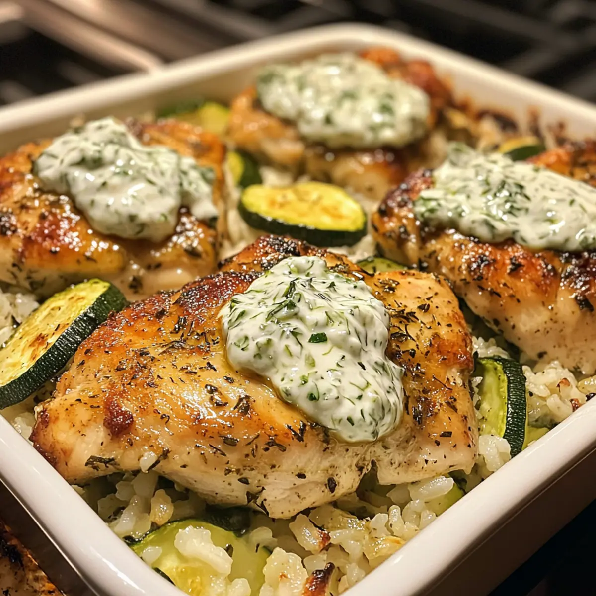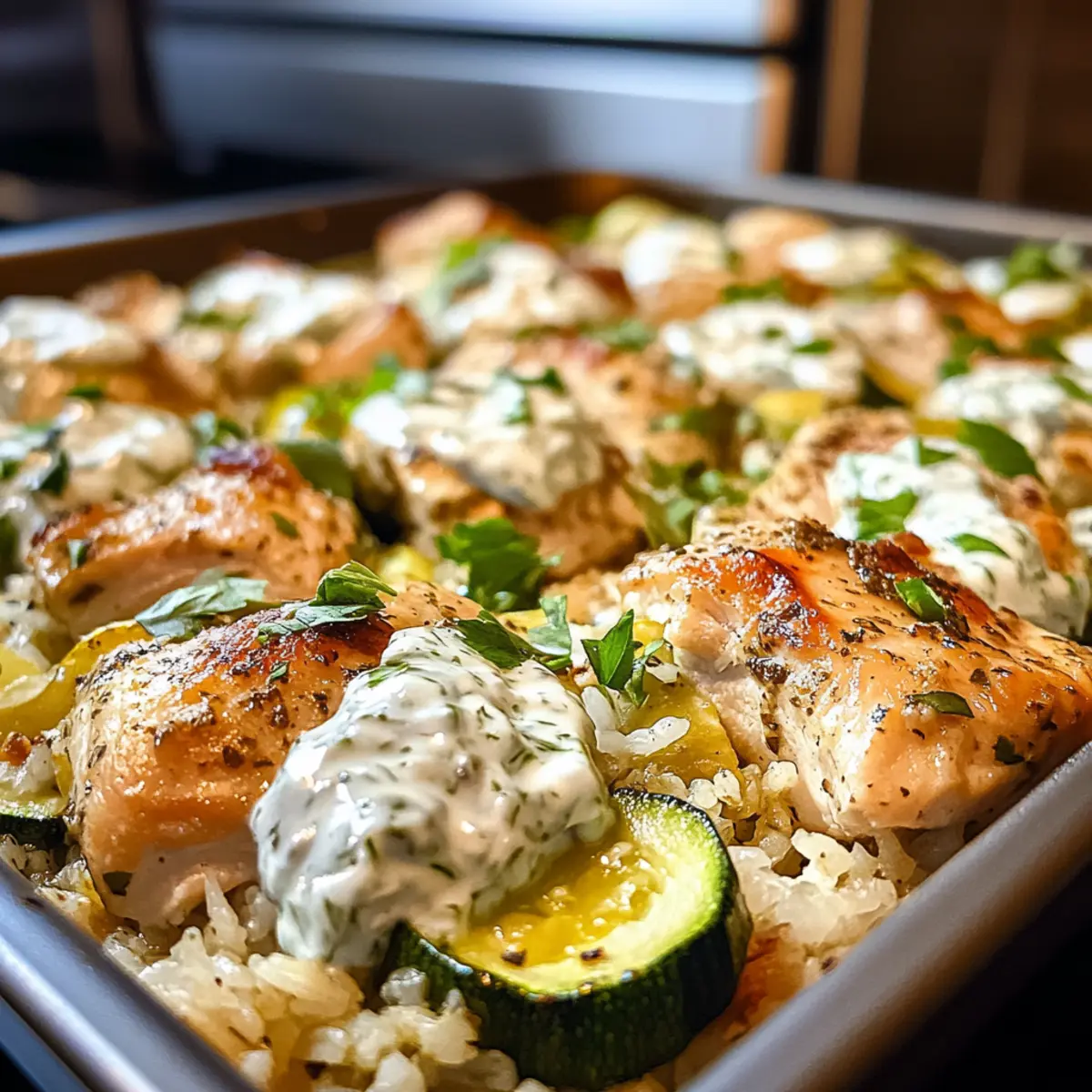 Once the rice and chicken are beautifully cooked, remove the dish from the oven. Top generously with tzatziki sauce, adding a refreshing creaminess that perfectly complements the warm flavors. Garnish with fresh herbs and a squeeze of lemon for brightness, making your Dump And Bake Chicken Tzatziki Rice not just a meal but a culinary experience.