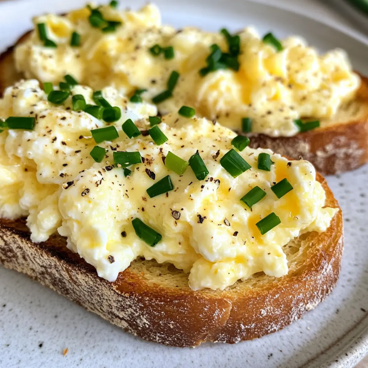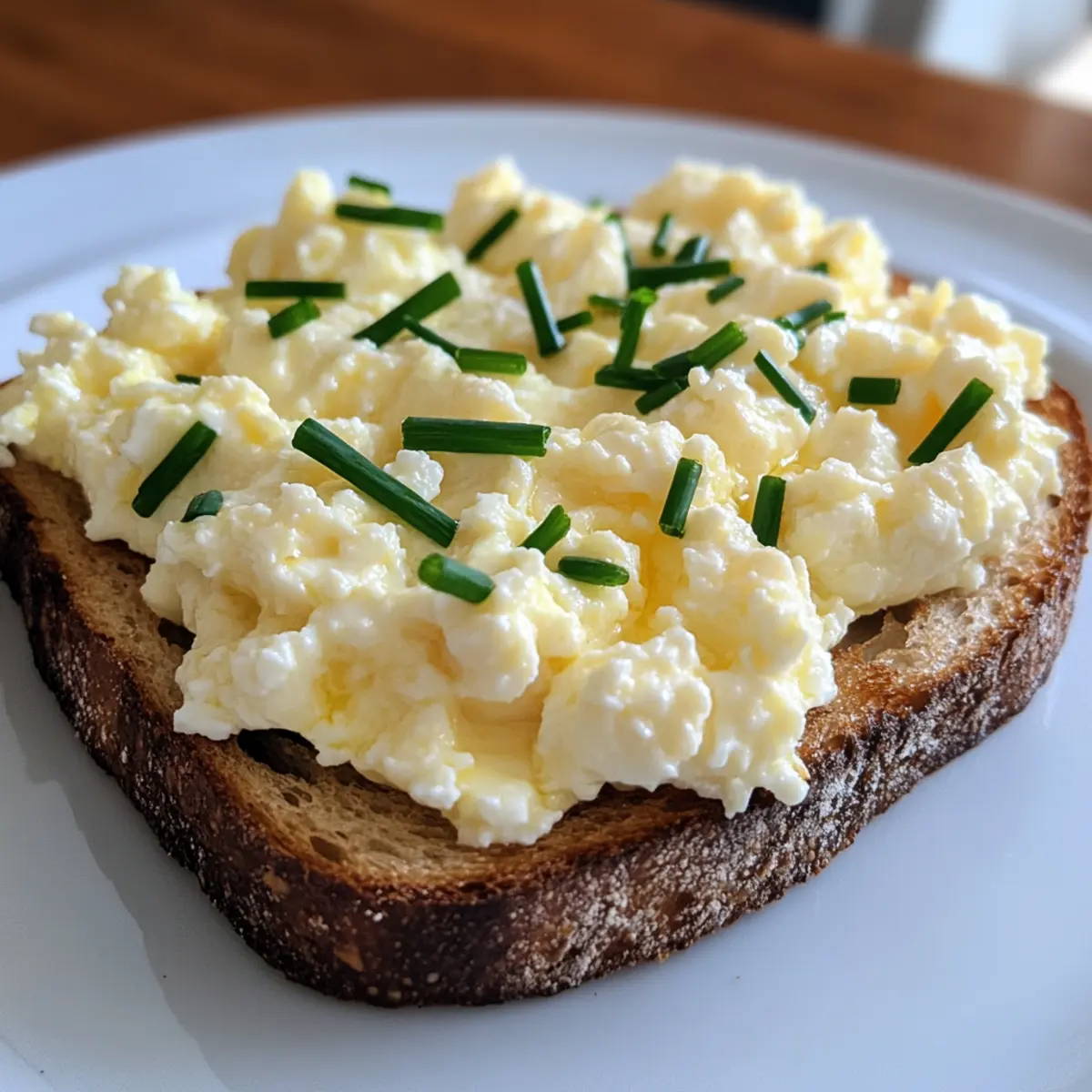 - Place the toasted bread on a serving plate and pile the creamy egg and ricotta mixture on top. Serve immediately.