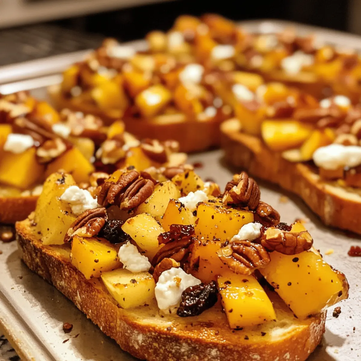 While the squash and apples roast, slice the ciabatta bread into ½-inch thick pieces and arrange them on a separate baking sheet. Place them in the oven for about 8-10 minutes until golden and crisp. Keep an eye on them to prevent over-toasting; you want that perfect crunch for your Fall Bruschetta base.