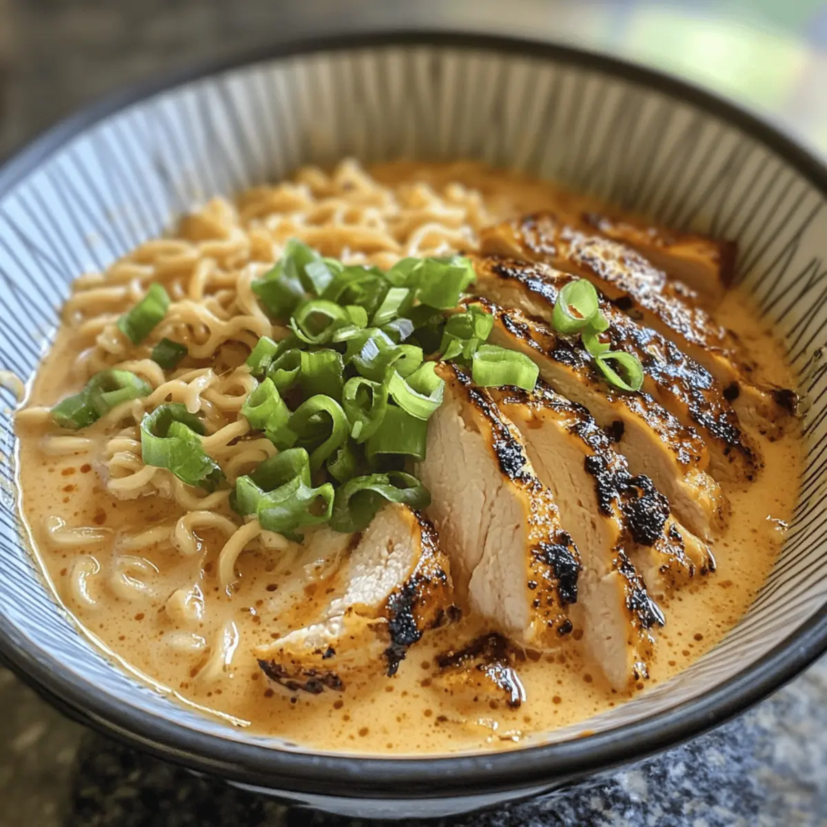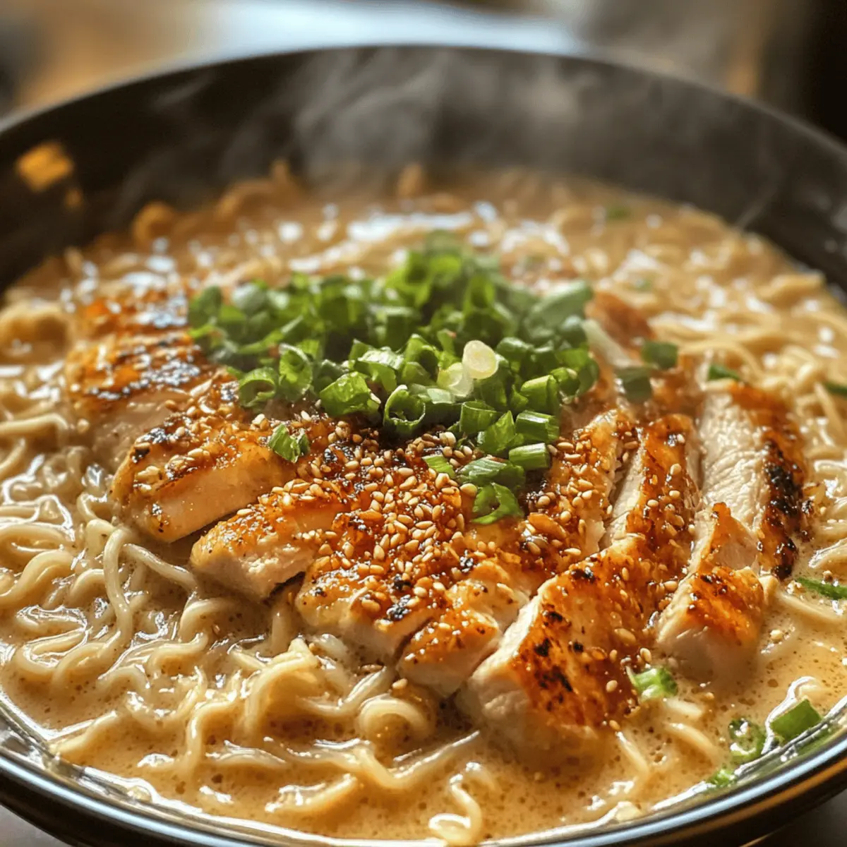 - Assemble ramen by placing noodles in bowls, ladling creamy garlic sauce over, and topping with sliced chicken.