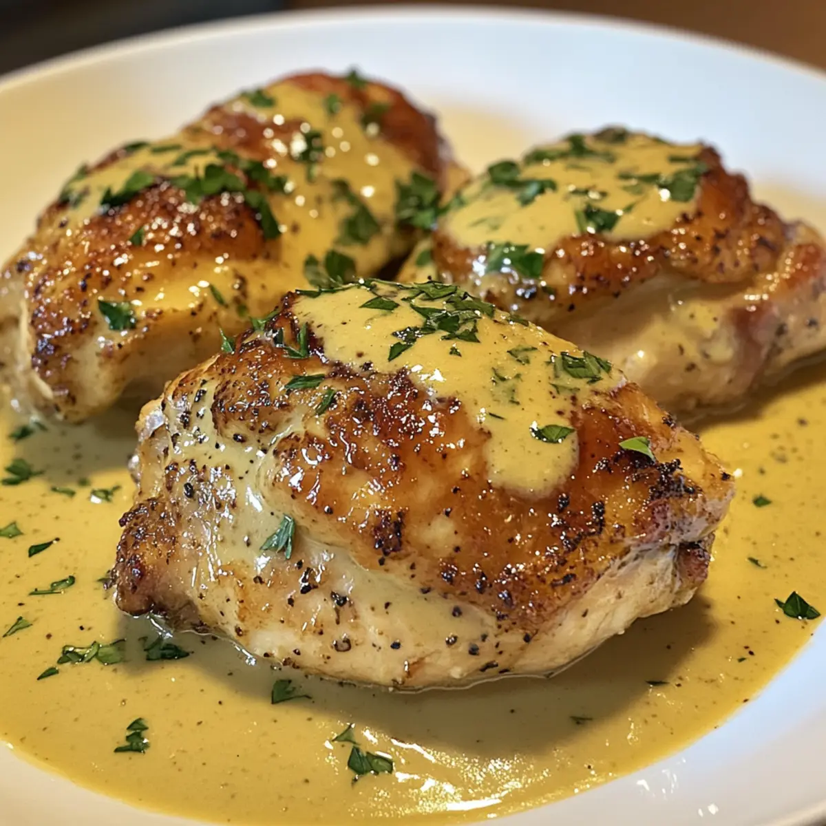 Once baked, remove the pan from the oven and discard the bay leaf. Garnish with freshly chopped parsley for a vibrant touch. Serve your Creamy Mustard Chicken hot, accompanied by your favorite sides, to enjoy a comforting meal that feels like a warm embrace.