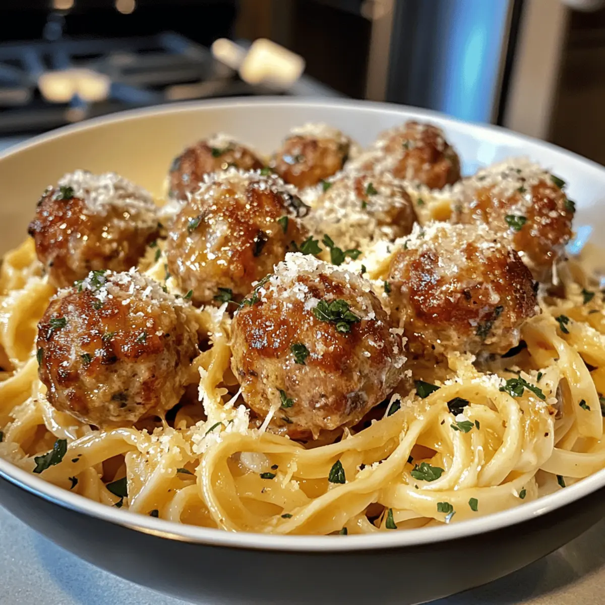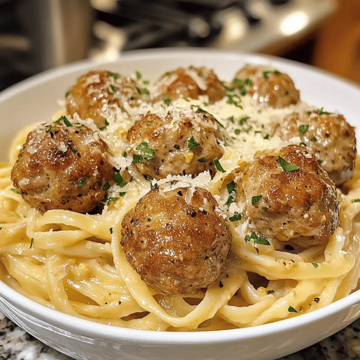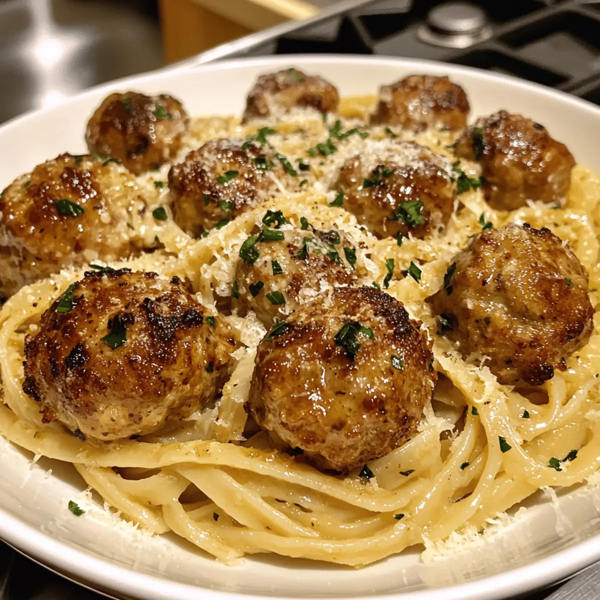 - Combine and Serve: Toss linguine with creamy sauce. Plate with meatballs on top, garnish with parsley and Parmesan. Serve immediately.