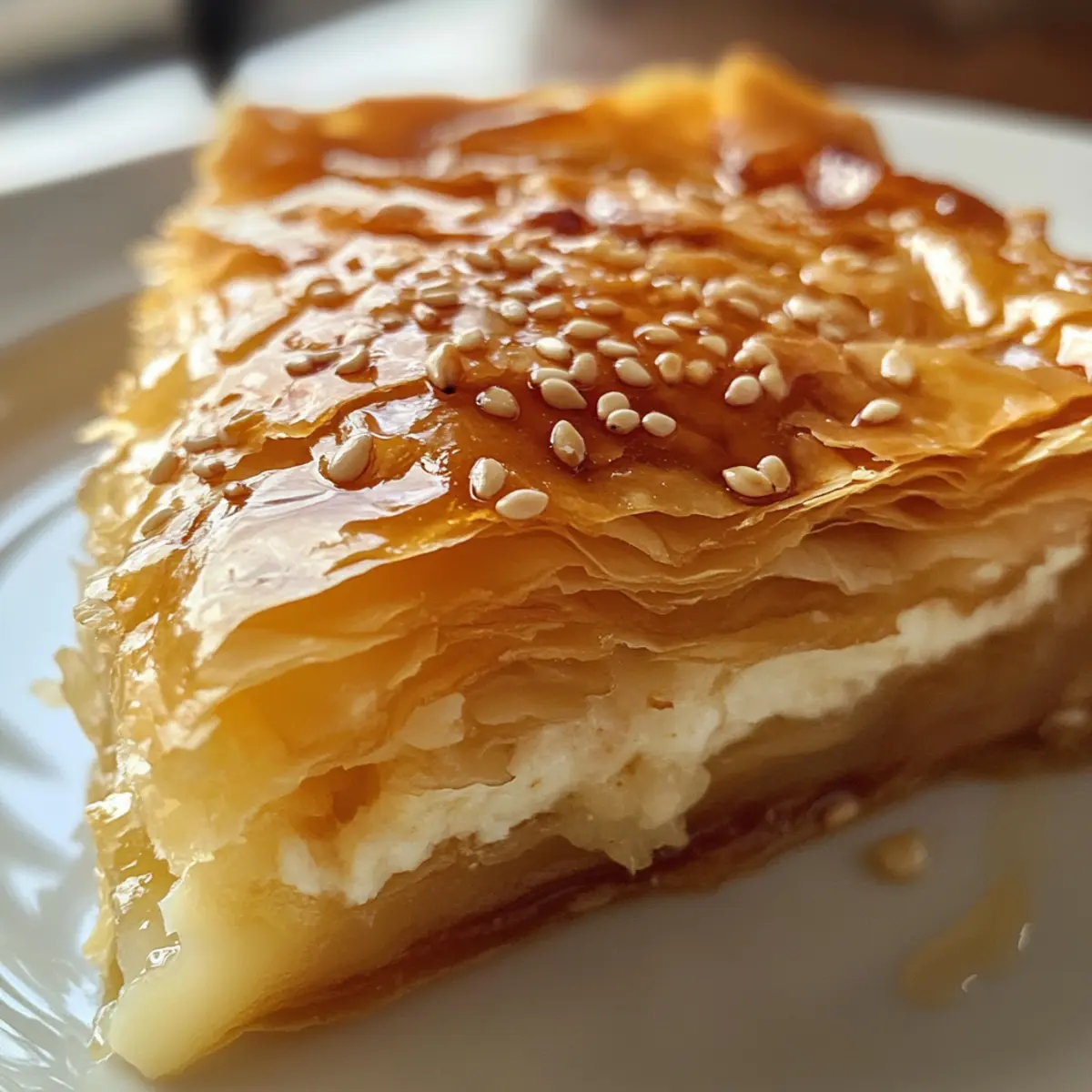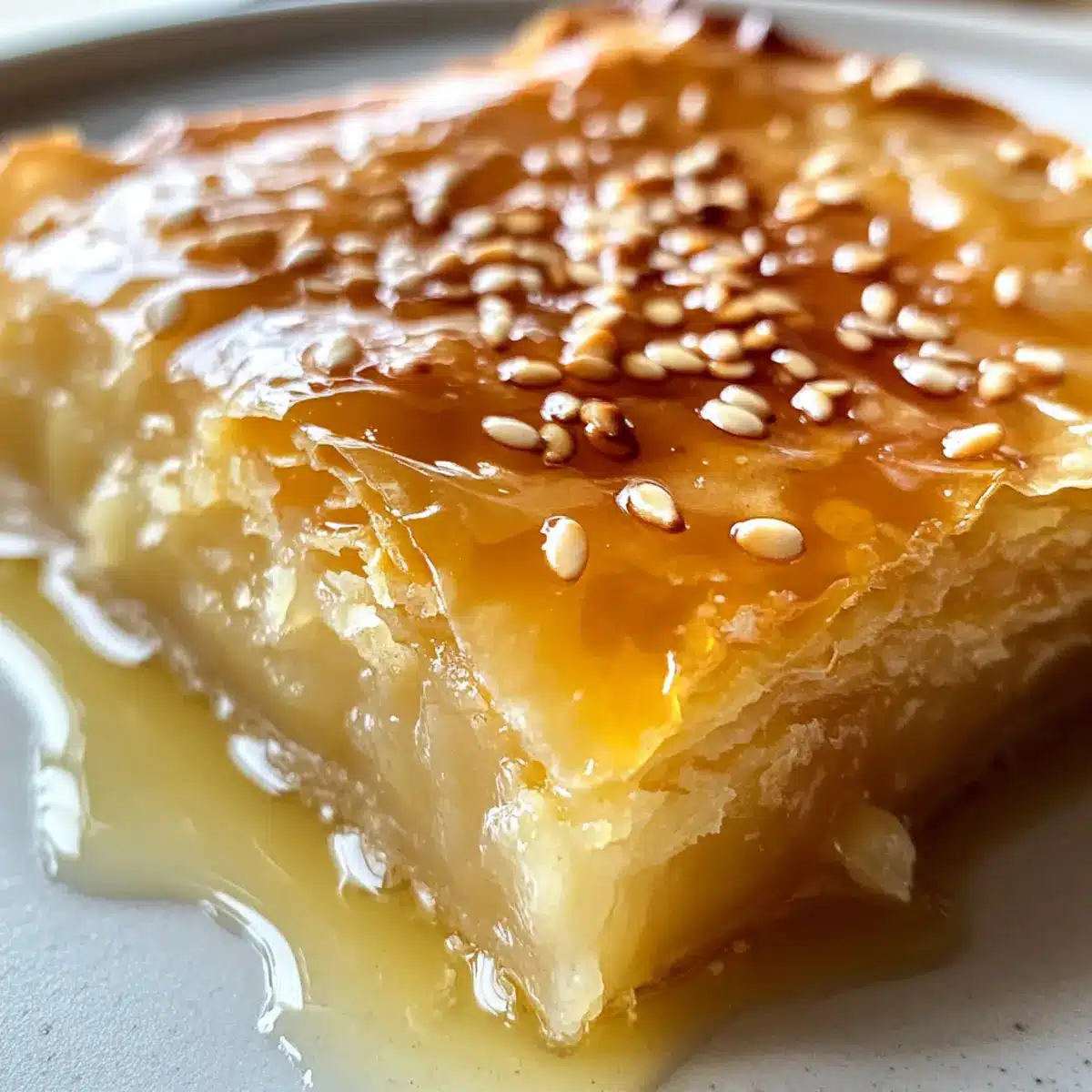 After baking, allow the pie to cool for about 10 minutes before slicing. Drizzle warmed honey over the top for an extra sweet touch and sprinkle with toasted sesame seeds for a delightful crunch. Serve your Golden Greek Honey Pie warm or at room temperature, inviting everyone to scoop up a slice of this delicious Mediterranean treat.