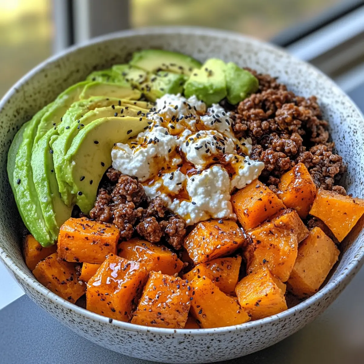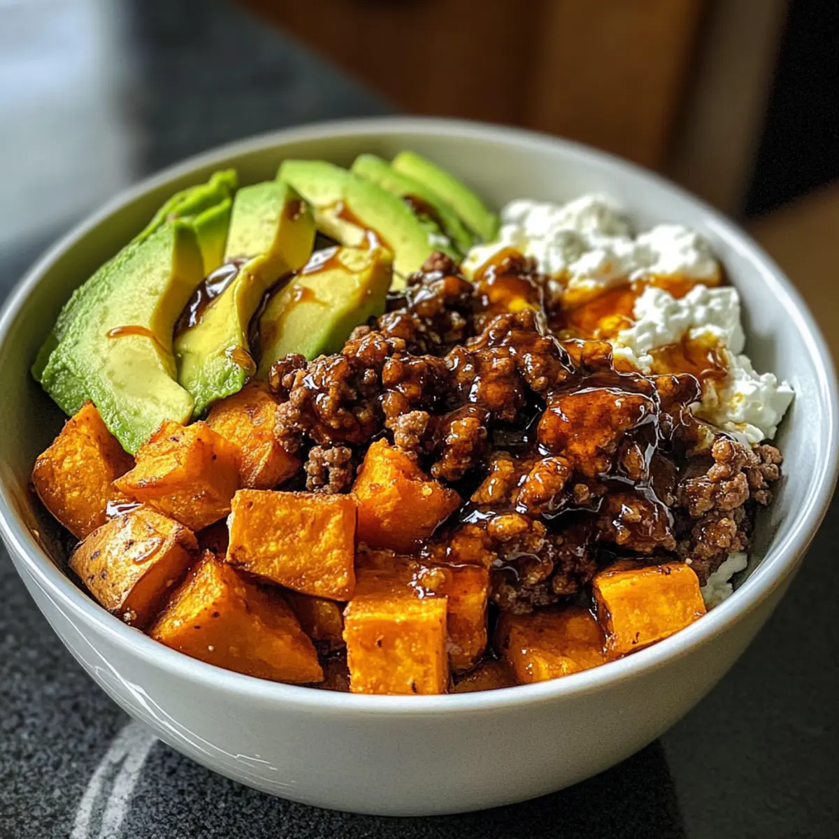 - Assemble your bowl with roasted sweet potatoes as the base, topped with ground beef, avocado slices, and cottage cheese.