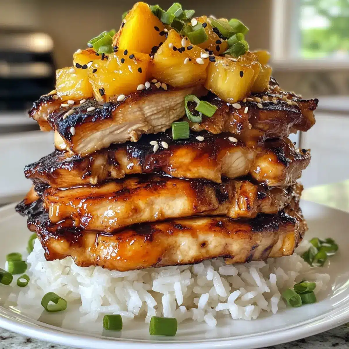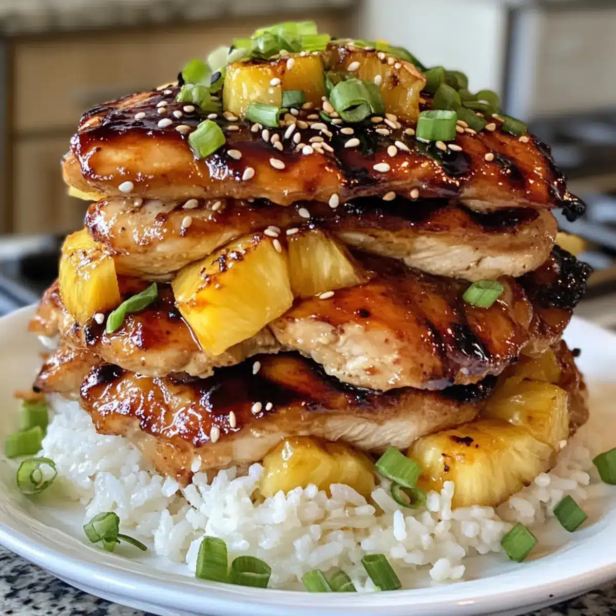- Assemble the Stack: Layer rice, grilled chicken, caramelized pineapple, drizzle glaze, and garnish with green onions and sesame seeds.