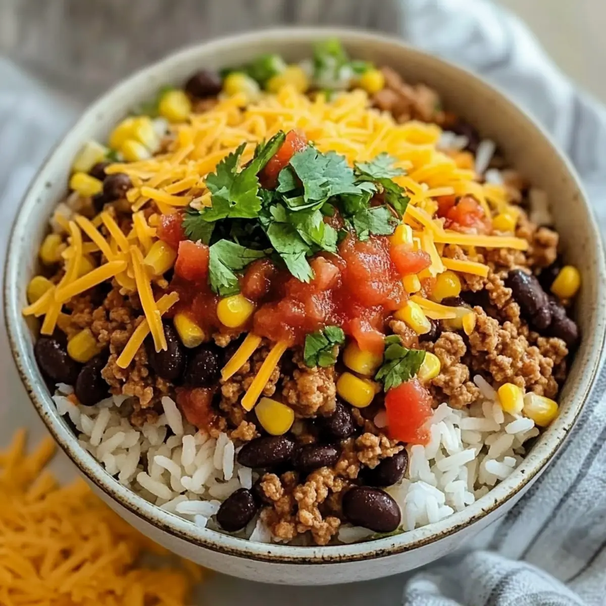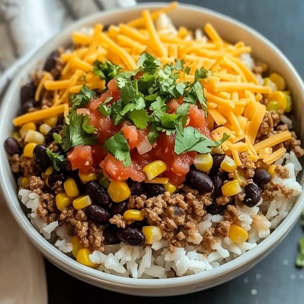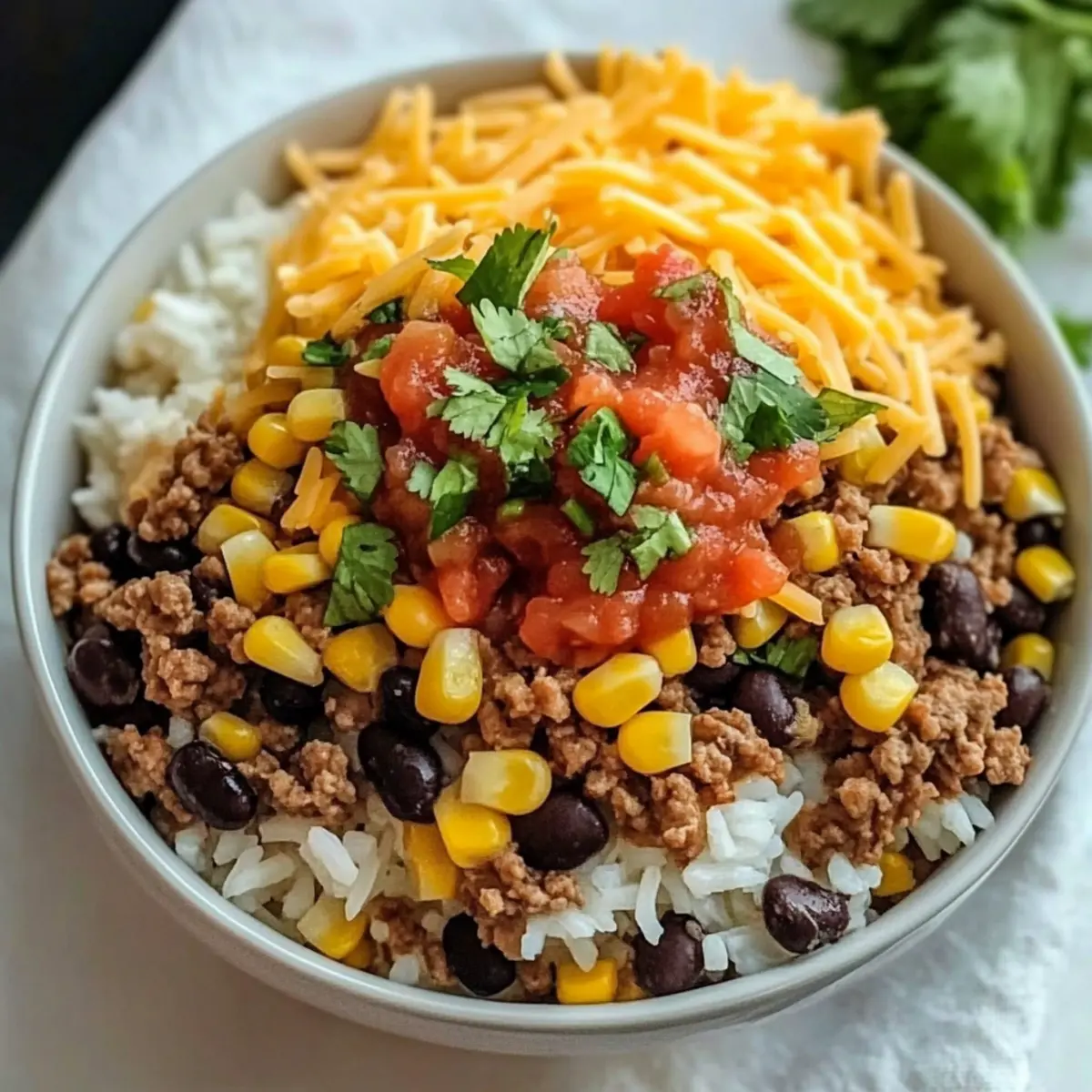 - Assemble bowls: layer rice, seasoned beef, black beans, corn, and top with cheddar cheese and salsa.