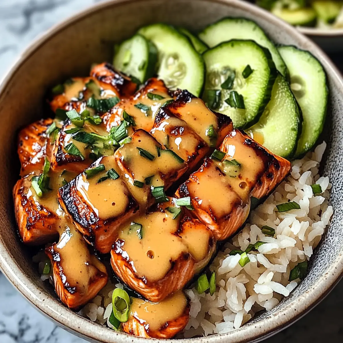 - Assemble your bowls with brown rice, roasted salmon, and cucumber salad. Drizzle remaining glaze over the top.