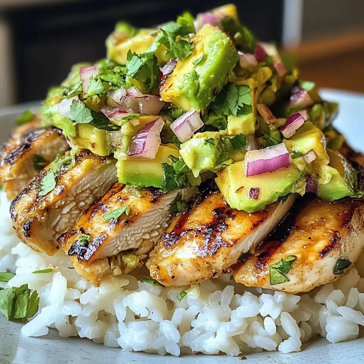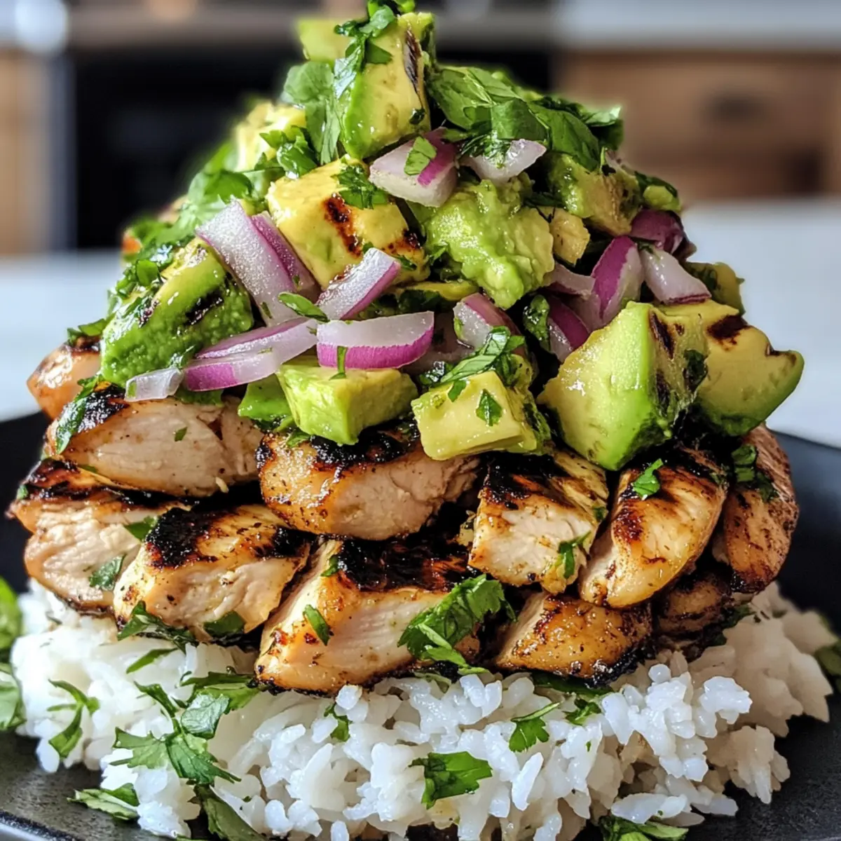 - To assemble, place jasmine rice on the plate, add sliced grilled chicken on top, and finish with the avocado topping.