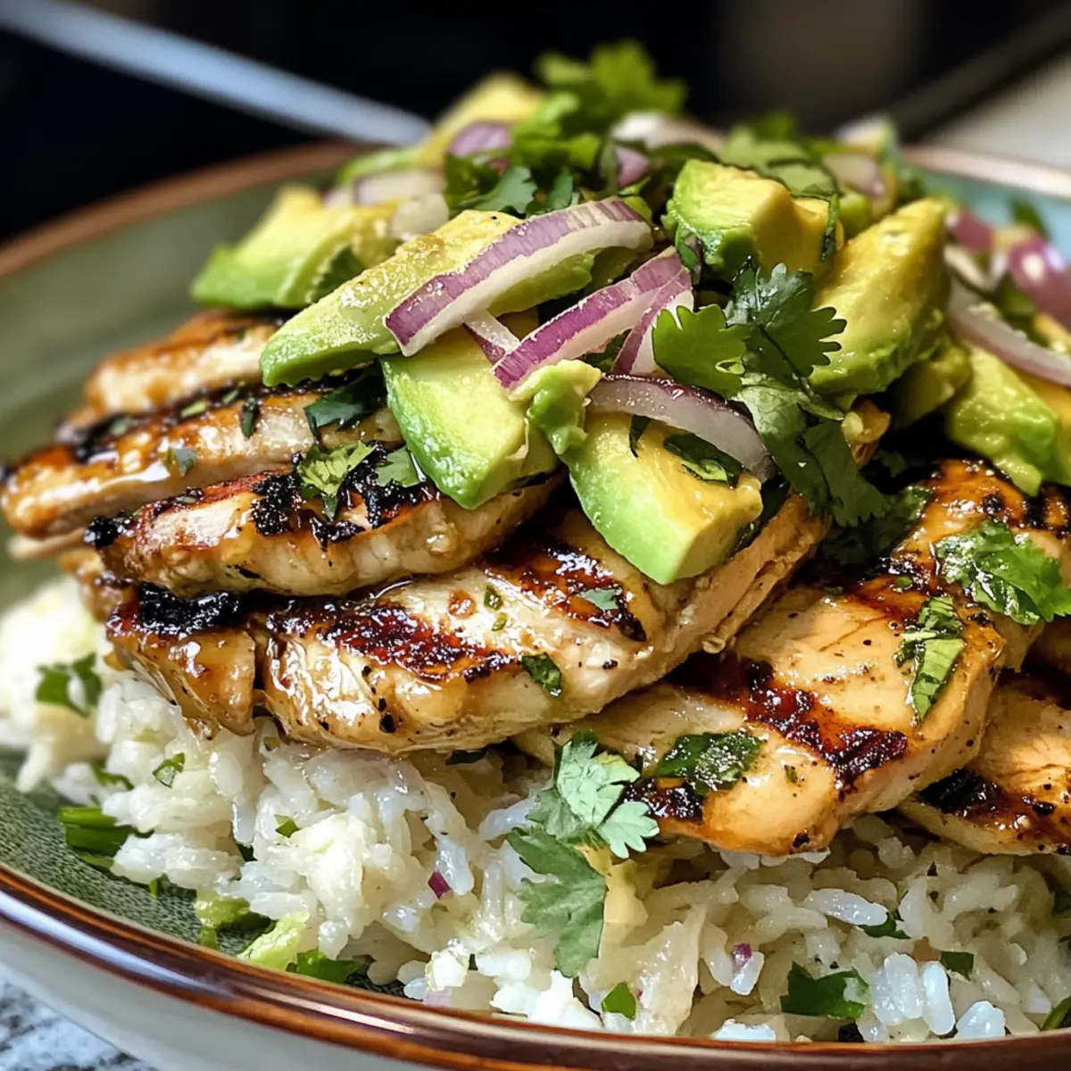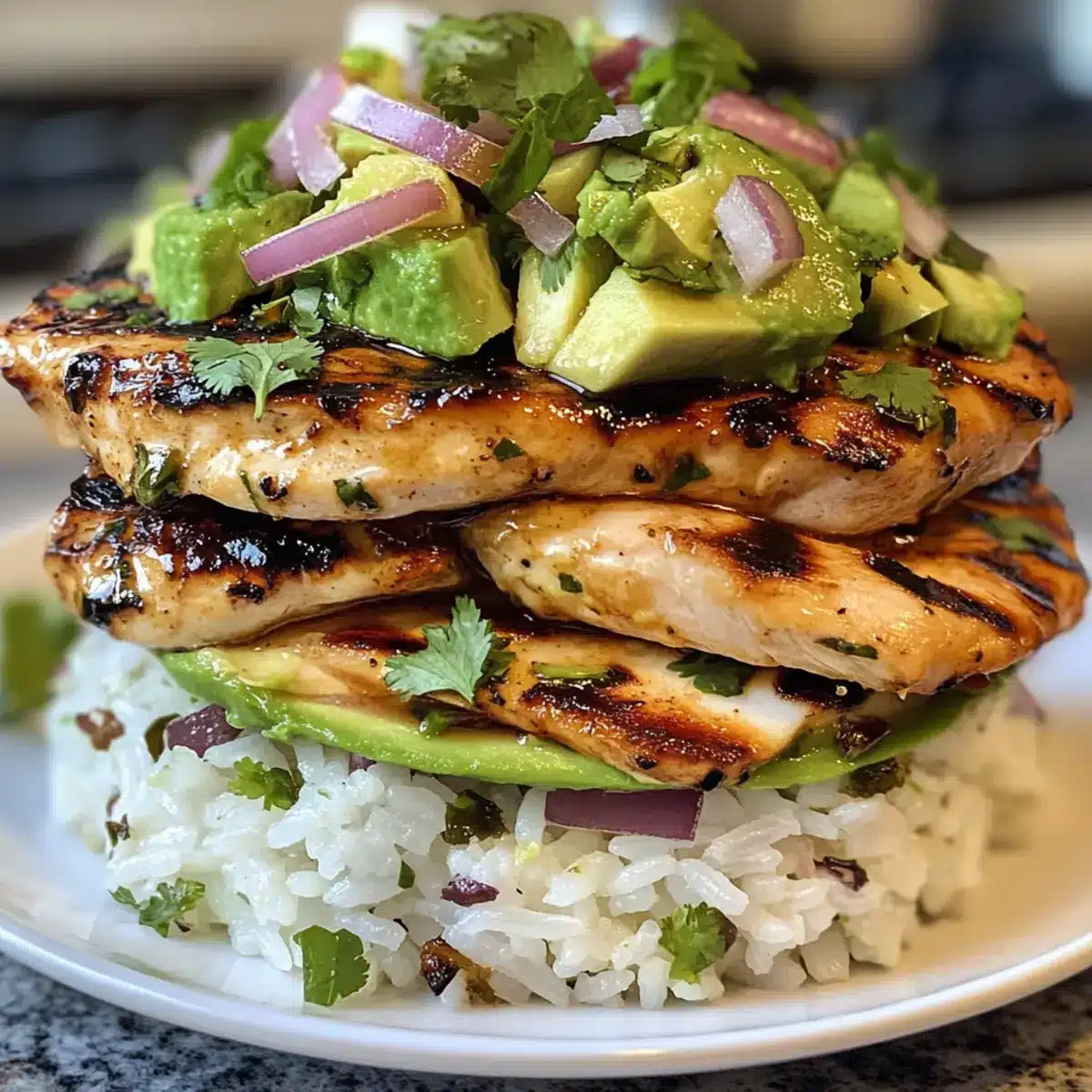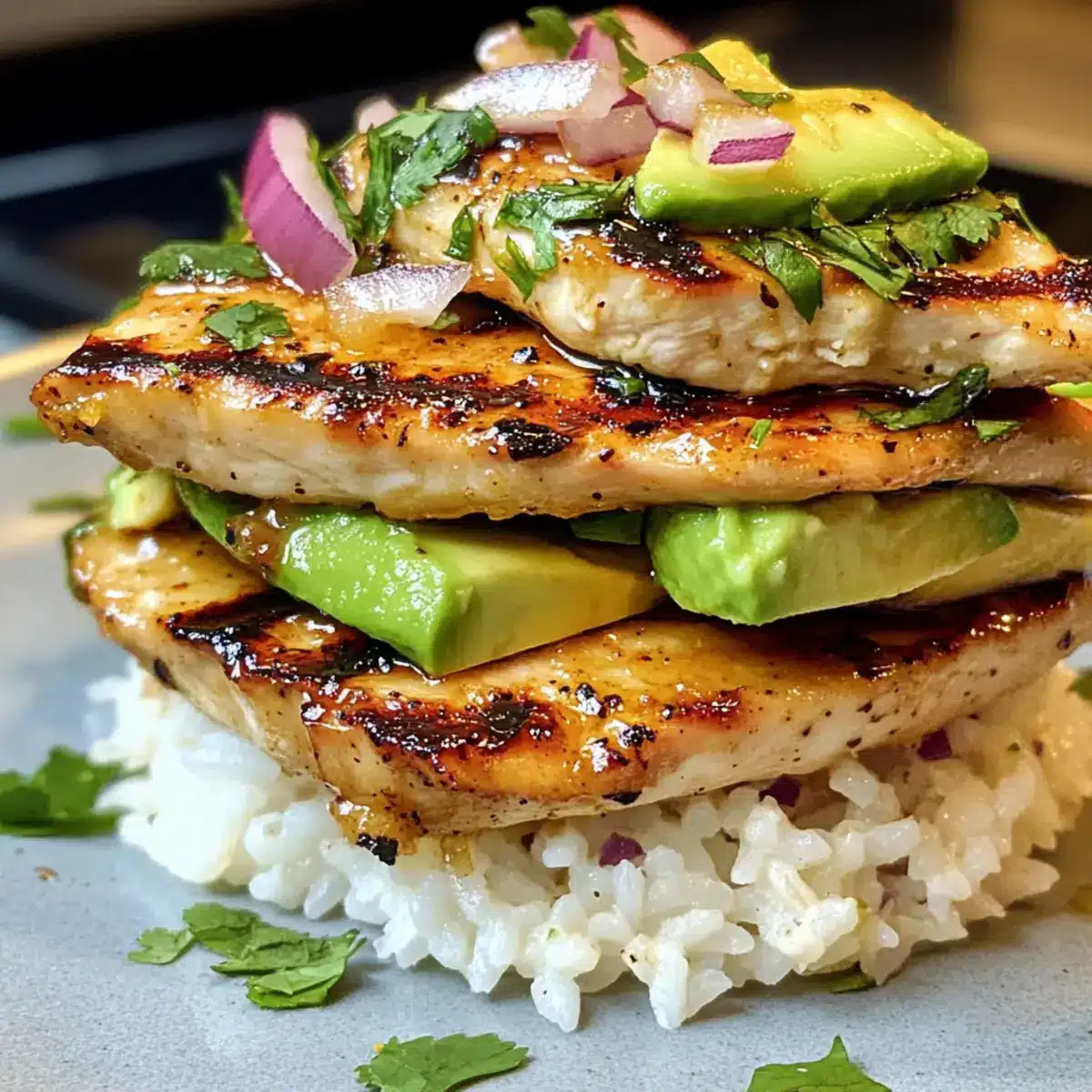 - Assemble the Stack: Start with jasmine rice, layer with grilled chicken, and top with avocado mixture.