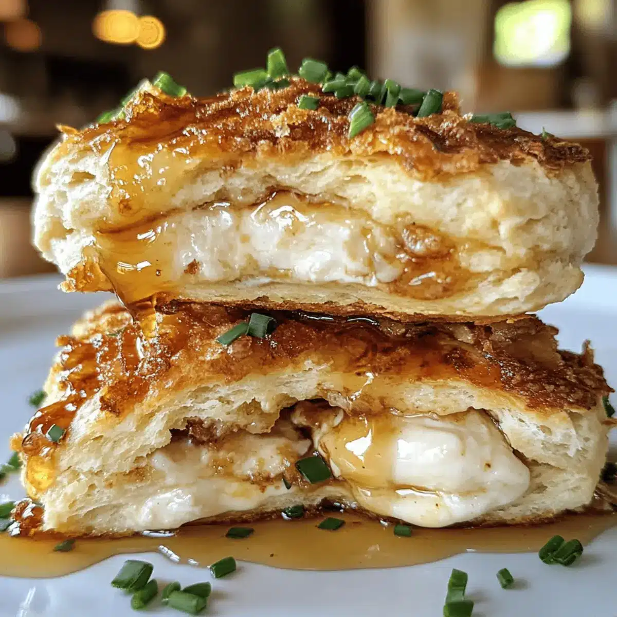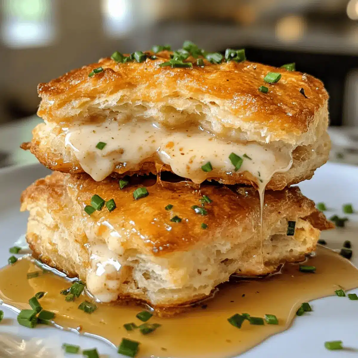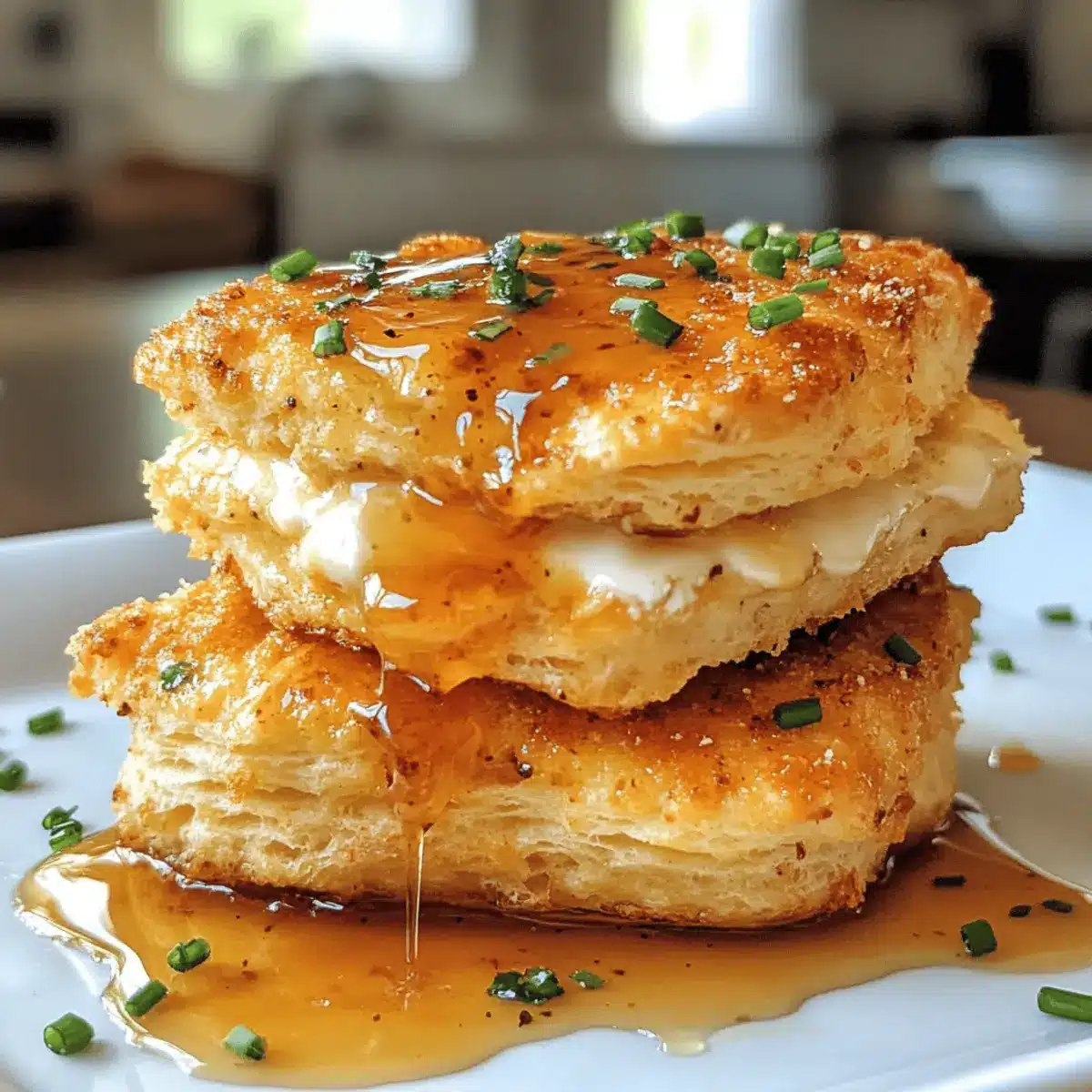 Once the biscuits and chicken are ready, split the hot honey chicken biscuits in half. Place a crispy chicken piece on the bottom half of each biscuit, drizzle generously with the hot honey sauce, and sprinkle fresh chopped chives on top for added flavor. Cap with the biscuit tops and enjoy your comforting spicy hot honey chicken biscuits!