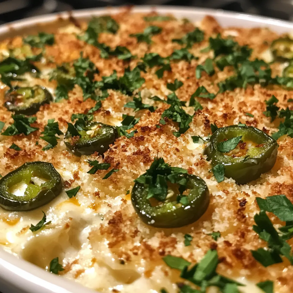 Sprinkle the breadcrumb mixture generously over the creamy layer in the baking dish. Make sure to cover the dip evenly, creating a mouthwatering crust that will contrast beautifully with the creamy interior. This step is crucial for adding that signature crunch to your Jalapeño Popper Dip.