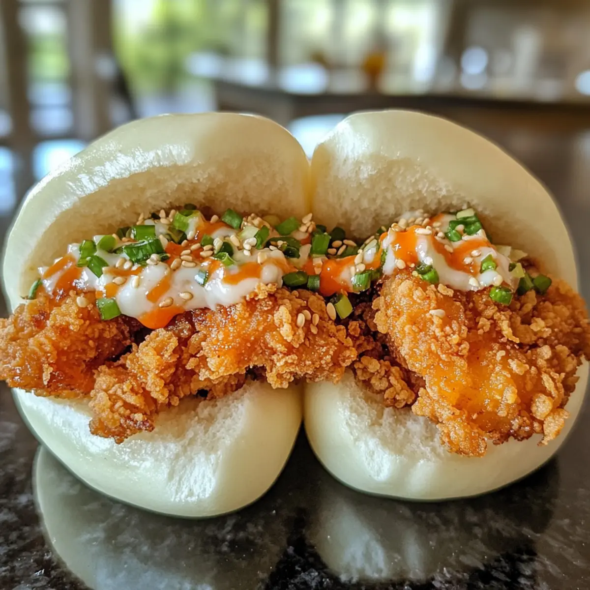 - Once the bao buns are steamed, take them out and let them cool slightly. Stuff each bao bun generously with the crispy fried chicken pieces and top with your choice of green onions, lettuce, Korean spicy mayo, sesame seeds, and pickled radishes. Serve warm.