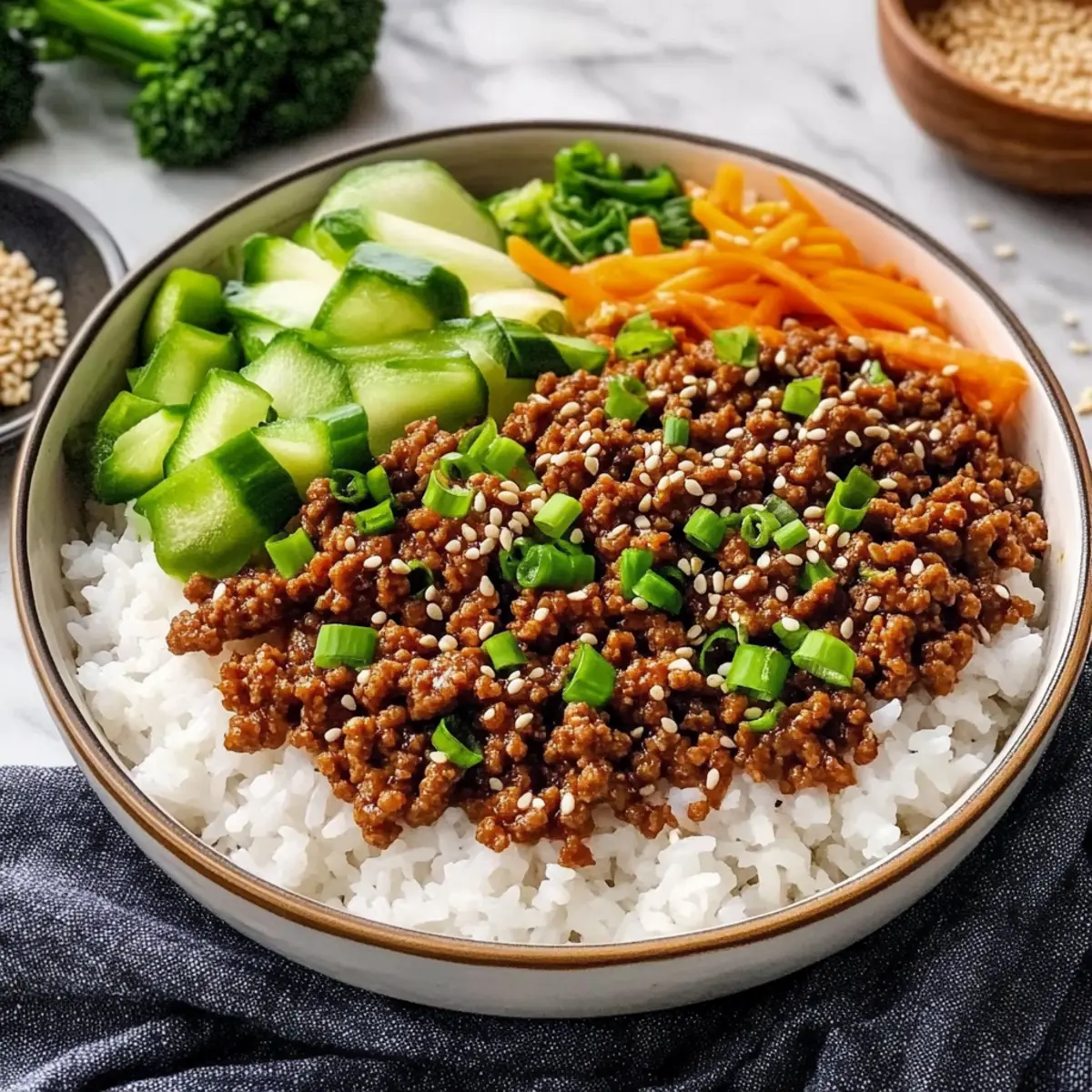 Prepare individual bowls by placing warm, cooked rice as the base. Spoon the savory beef mixture on top, allowing the sauce to drizzle. Garnish your Korean Ground Beef Bowl with sliced green onions, sesame seeds, and any additional vegetables you prefer, like cucumbers or carrots, for a fresh crunch. Enjoy this quick, flavorful dish!