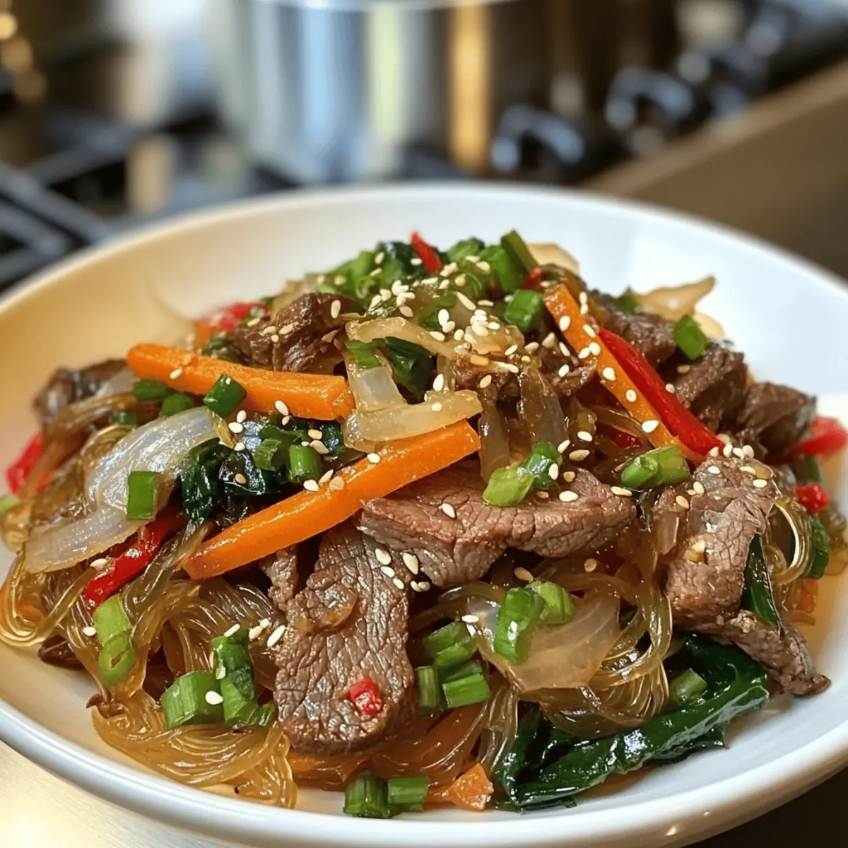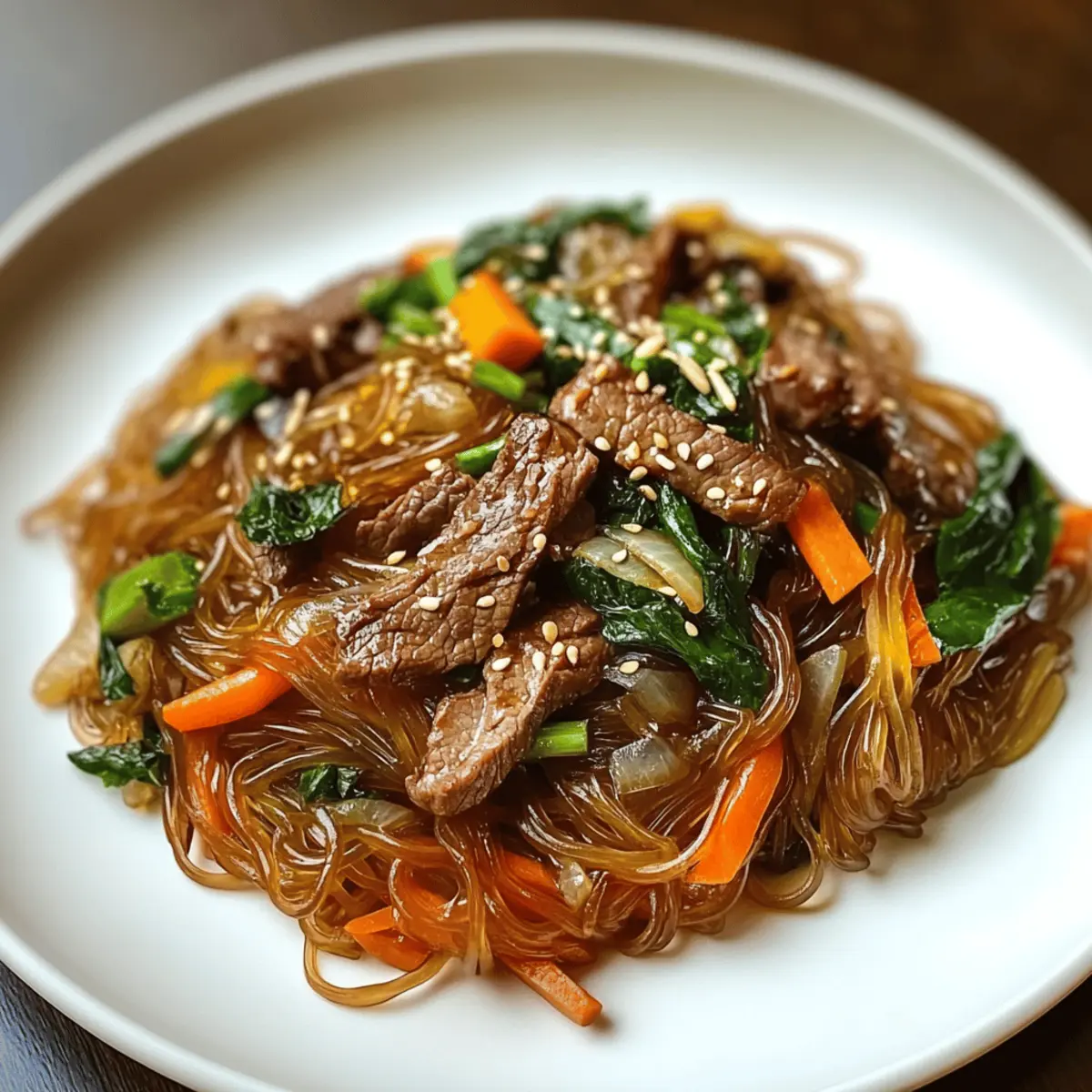 Crispy Texture: Top your japchae with toasted sesame seeds or crushed peanuts for an added crunch.