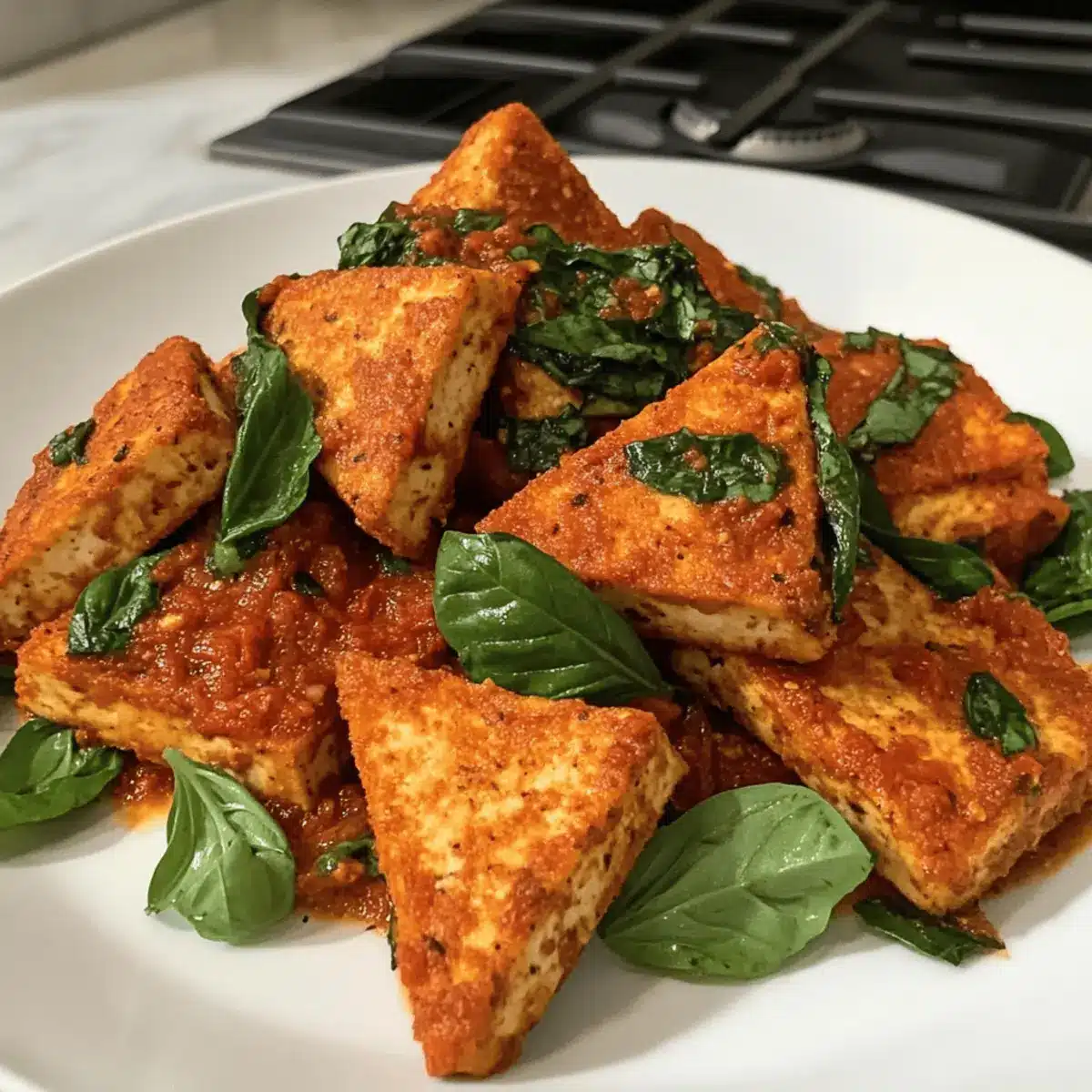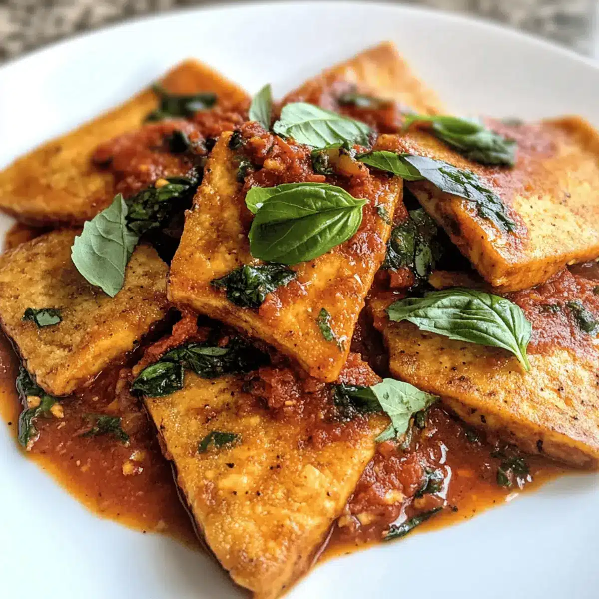 Stir in the fresh basil leaves and optional vegan parmesan, allowing the flavors to meld for an additional 1-2 minutes. Finally, return the crispy tofu pieces back to the skillet, gently coating them in the rich sauce until everything is well combined.