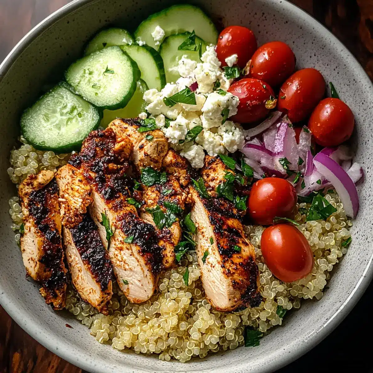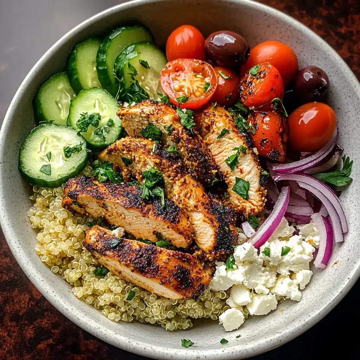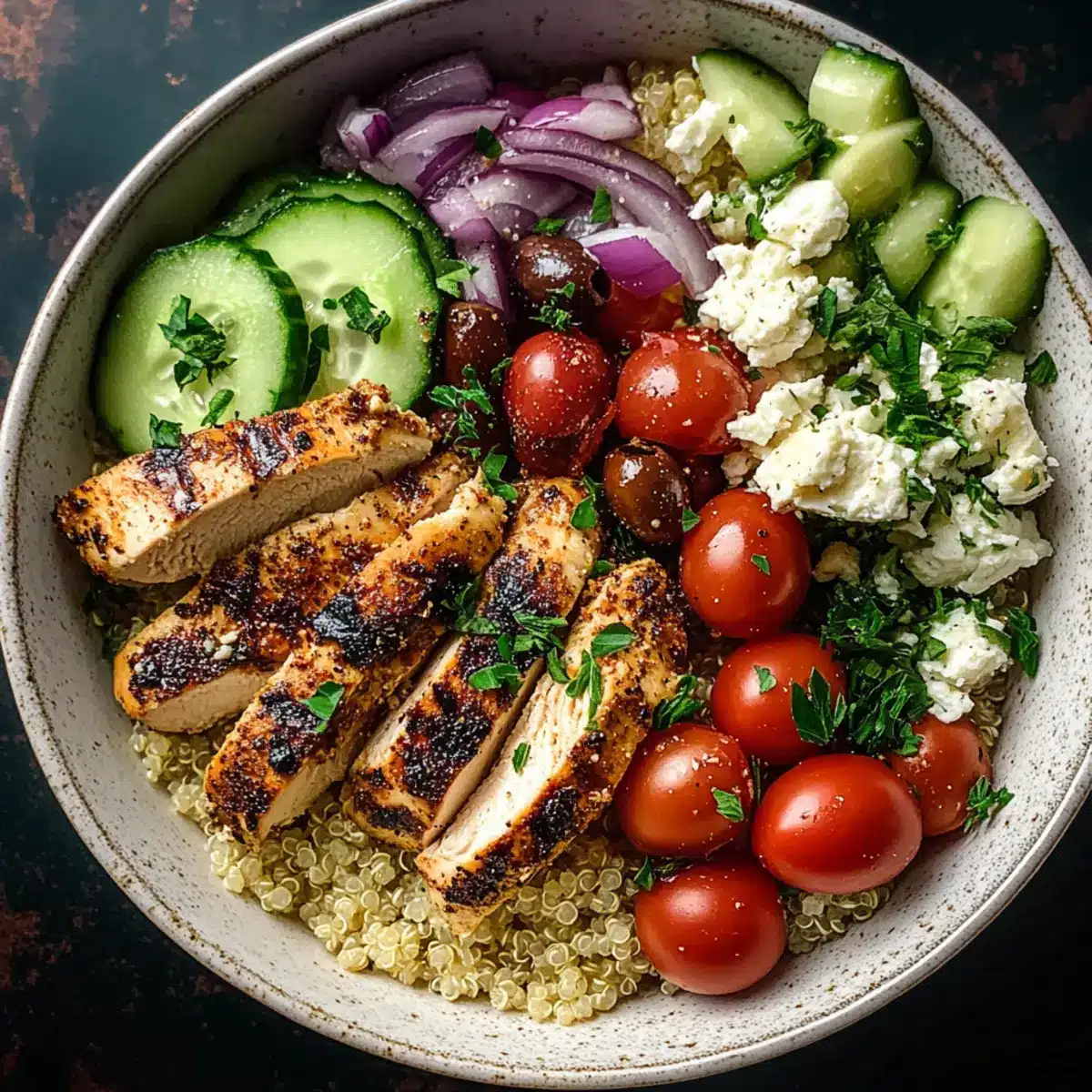 - Assemble bowls with quinoa base, topped with sliced chicken, cherry tomatoes, cucumber, red onion, and Kalamata olives.