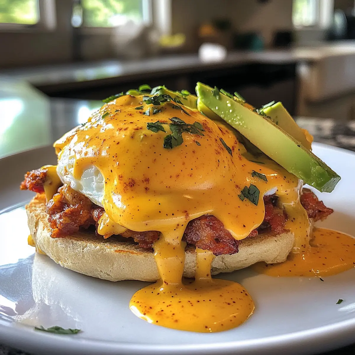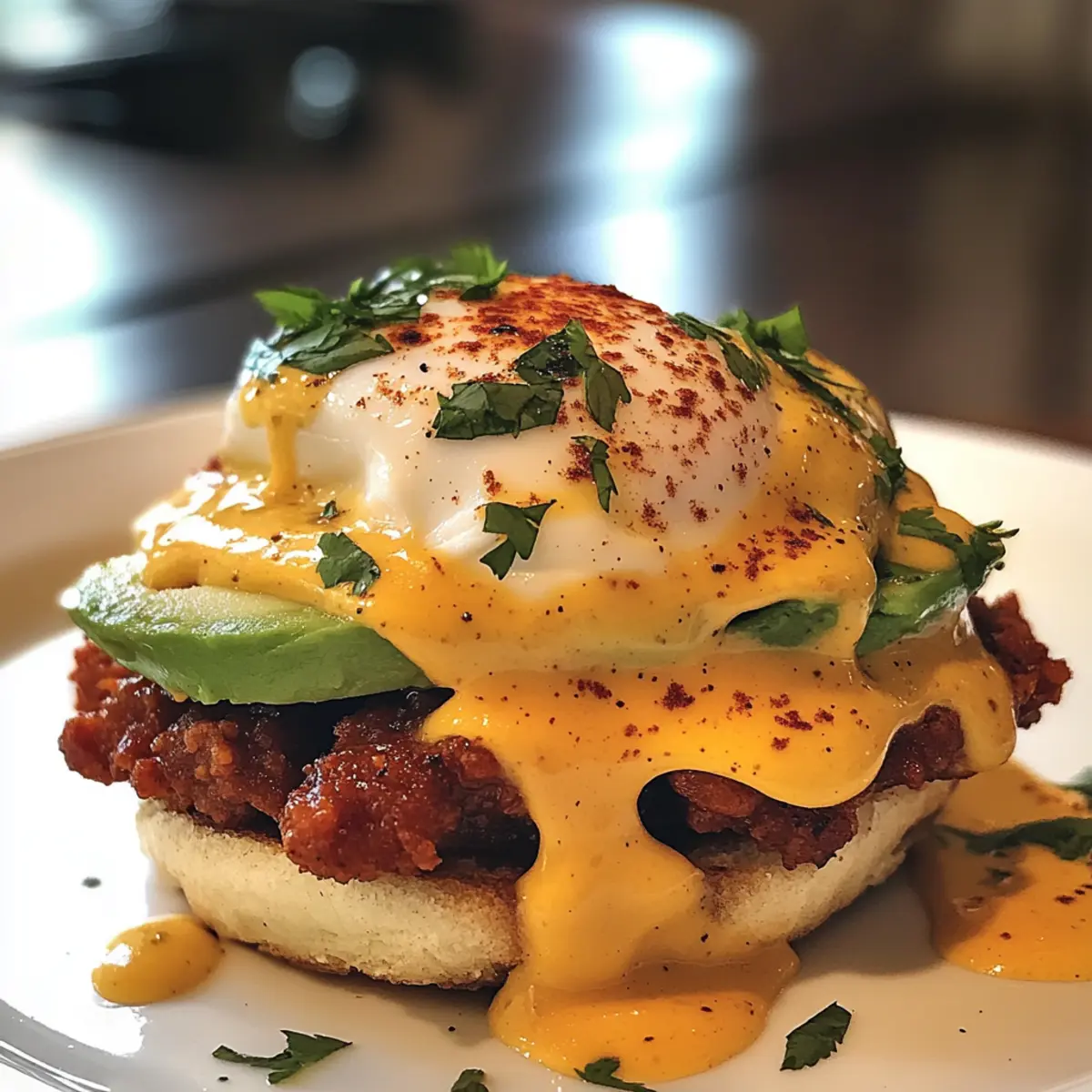 To bring your Mexican Eggs Benedict together, take each buttered muffin half topped with chorizo and gently place one poached egg on top. Drizzle the rich chipotle hollandaise over the eggs, allowing it to cascade down the sides. Finally, garnish with a sprinkle of chili powder, salt, and pepper to taste. Serve immediately, ensuring your brunch is vibrant, flavorful, and sure to impress!