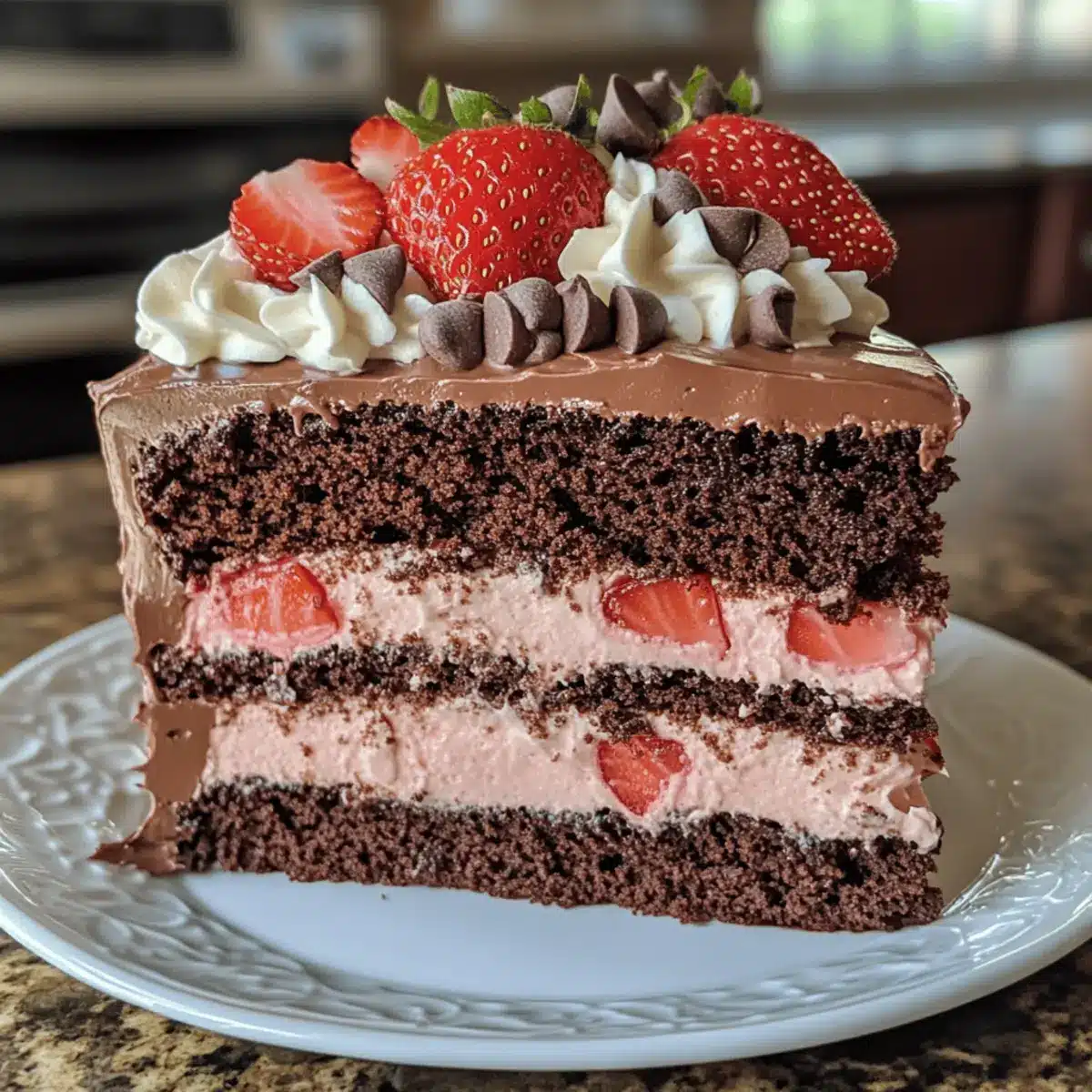 - Assemble the cake by placing the chocolate layer down, spreading frosting, followed by the vanilla layer, more frosting, and topping with the strawberry layer.