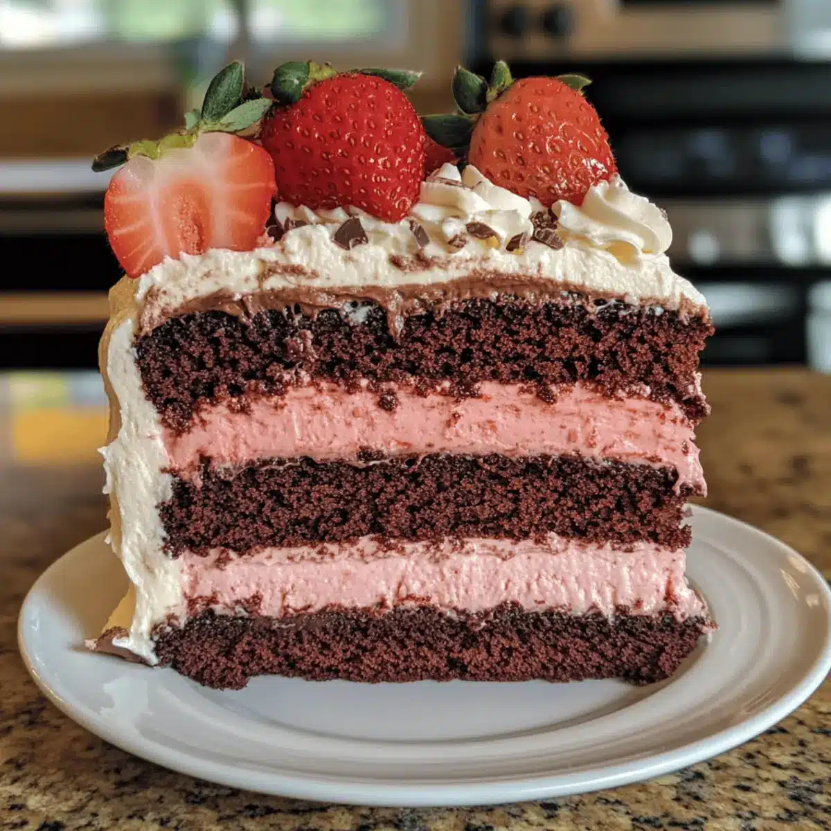 Layers of Delight: With vibrant layers of chocolate, vanilla, and strawberry, this cake is visually stunning.
