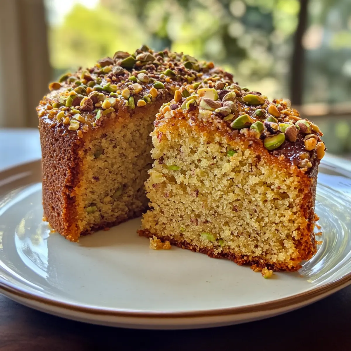 - Pour the batter into the prepared cake pan and sprinkle the remaining chopped pistachios on top.