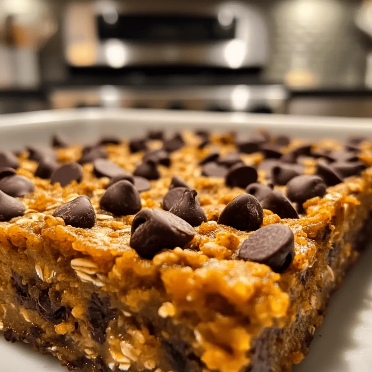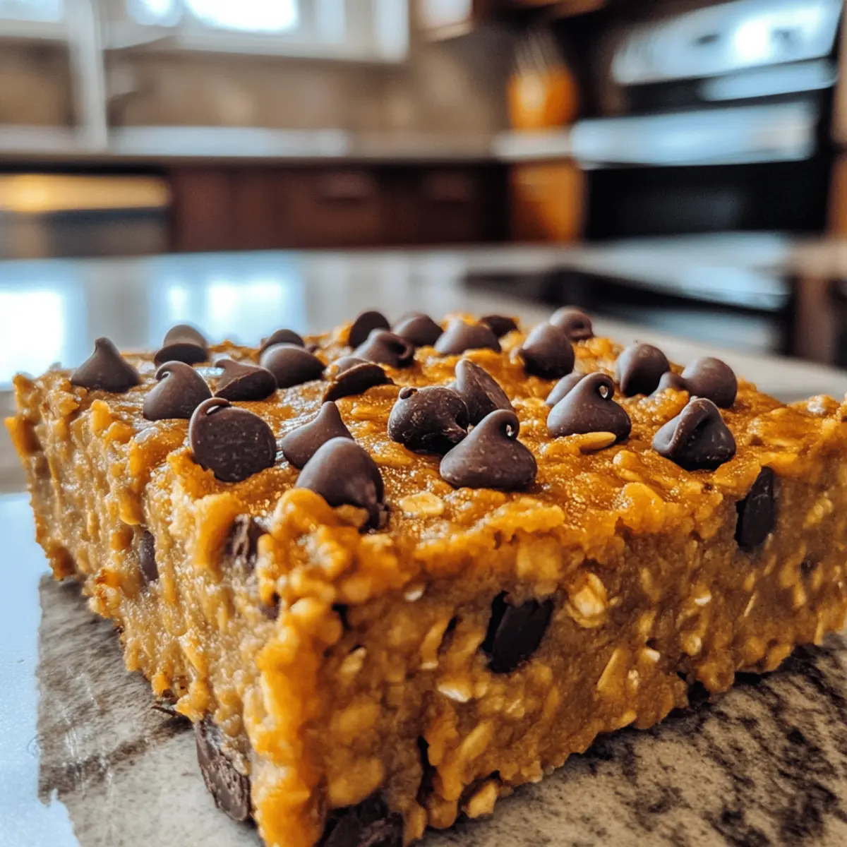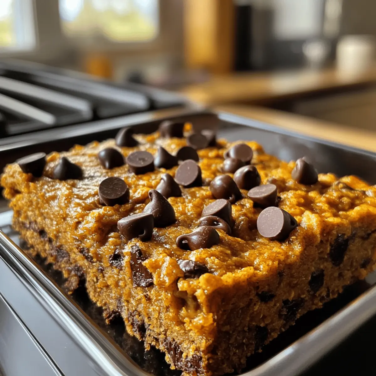 Pour the assembled batter into your prepared baking dish, spreading it out evenly with a spatula. For an extra touch of sweetness, feel free to sprinkle additional chocolate chips on top. This step will create a delightful layer of gooey chocolate that melts during baking, enhancing the overall flavor of your Pumpkin Baked Oatmeal.