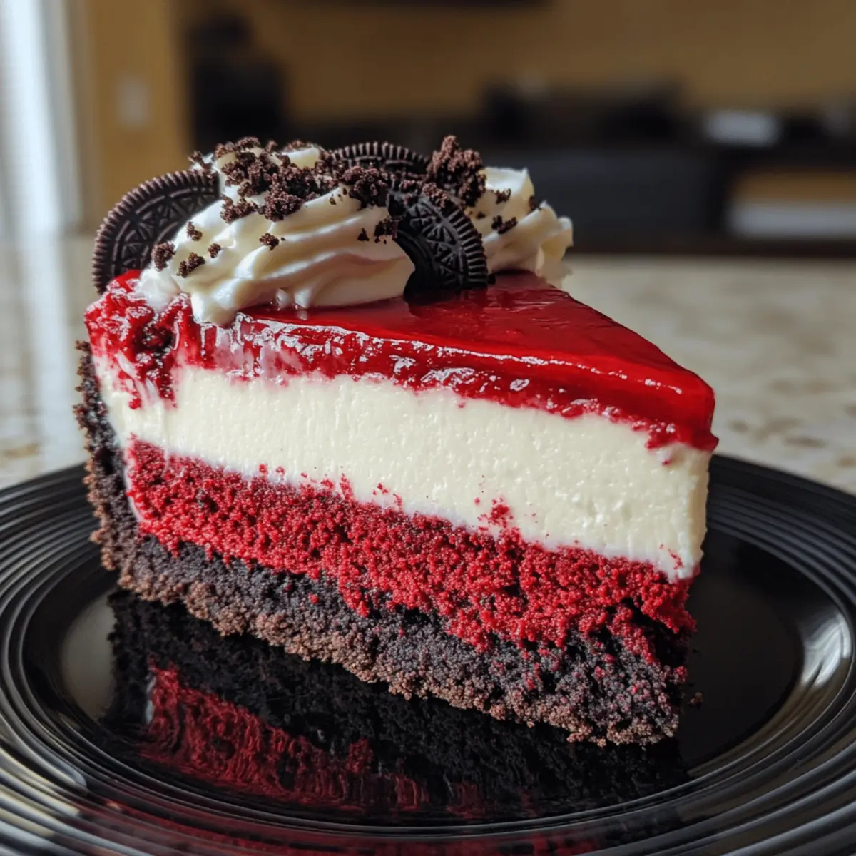 Visual Stunner: The vibrant red contrasted with the dark Oreo crust makes this cheesecake a feast for the eyes—ideal for gatherings or special occasions.