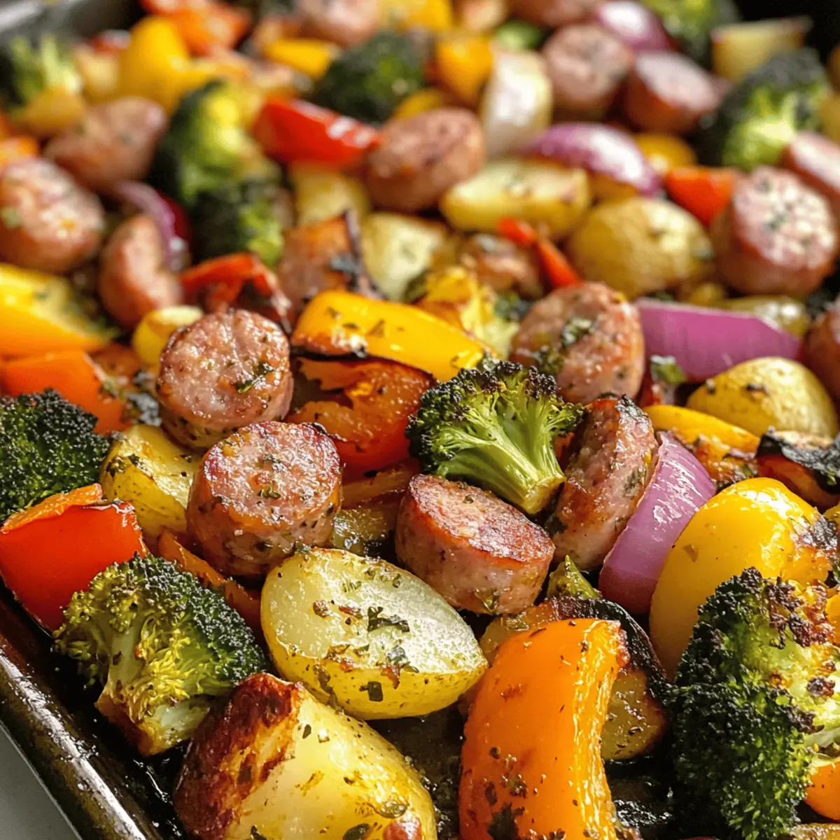 Slide the pan into the preheated oven and bake for 30-35 minutes. Stir the mixture halfway through cooking, ensuring that everything roasts evenly and develops a beautiful caramelization. The sausage should be cooked through, and the veggies should be tender and slightly charred, creating a delightful aroma in your kitchen.