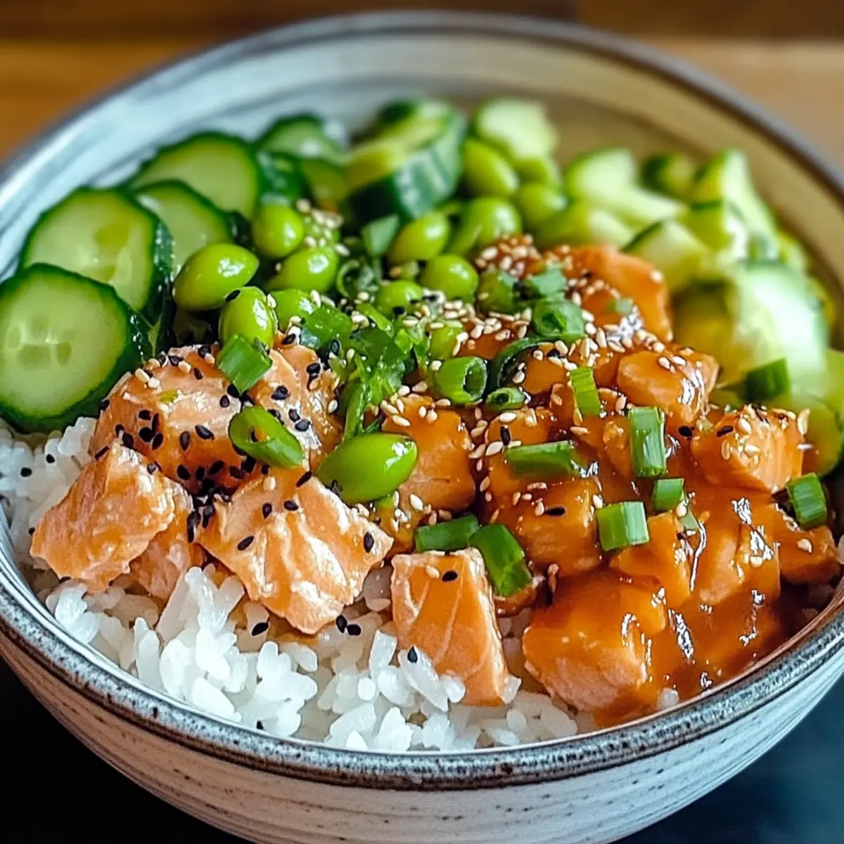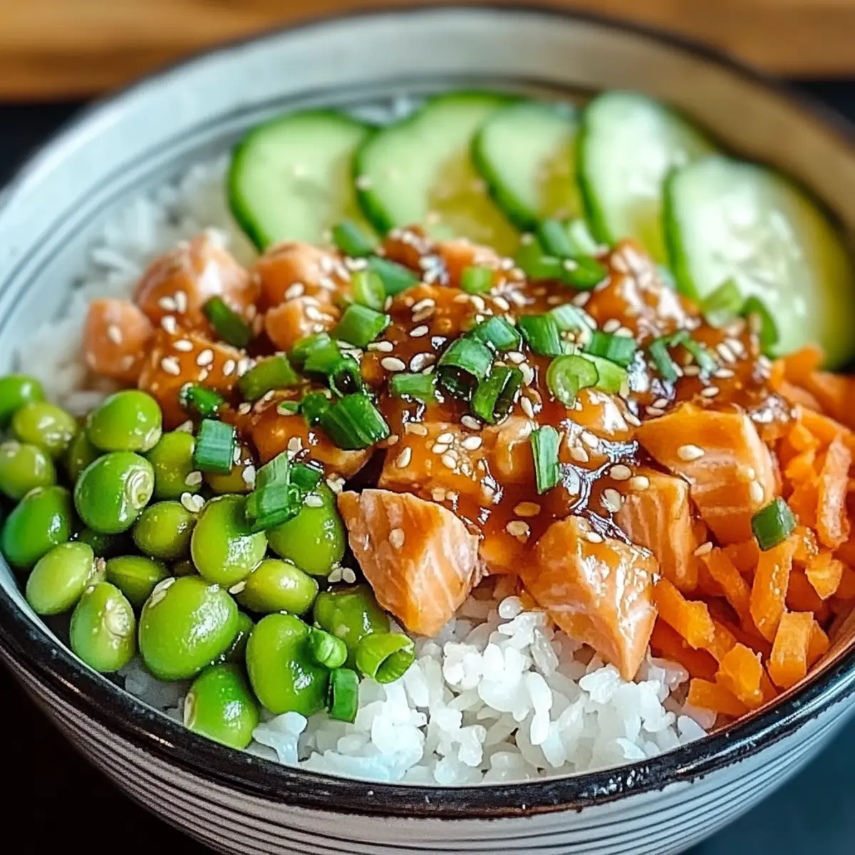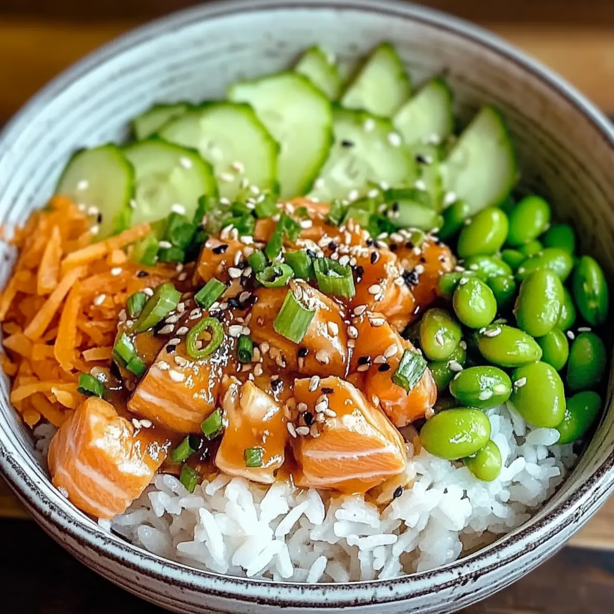 - Assemble bowls with rice topped with salmon mixture and arranged vegetables.