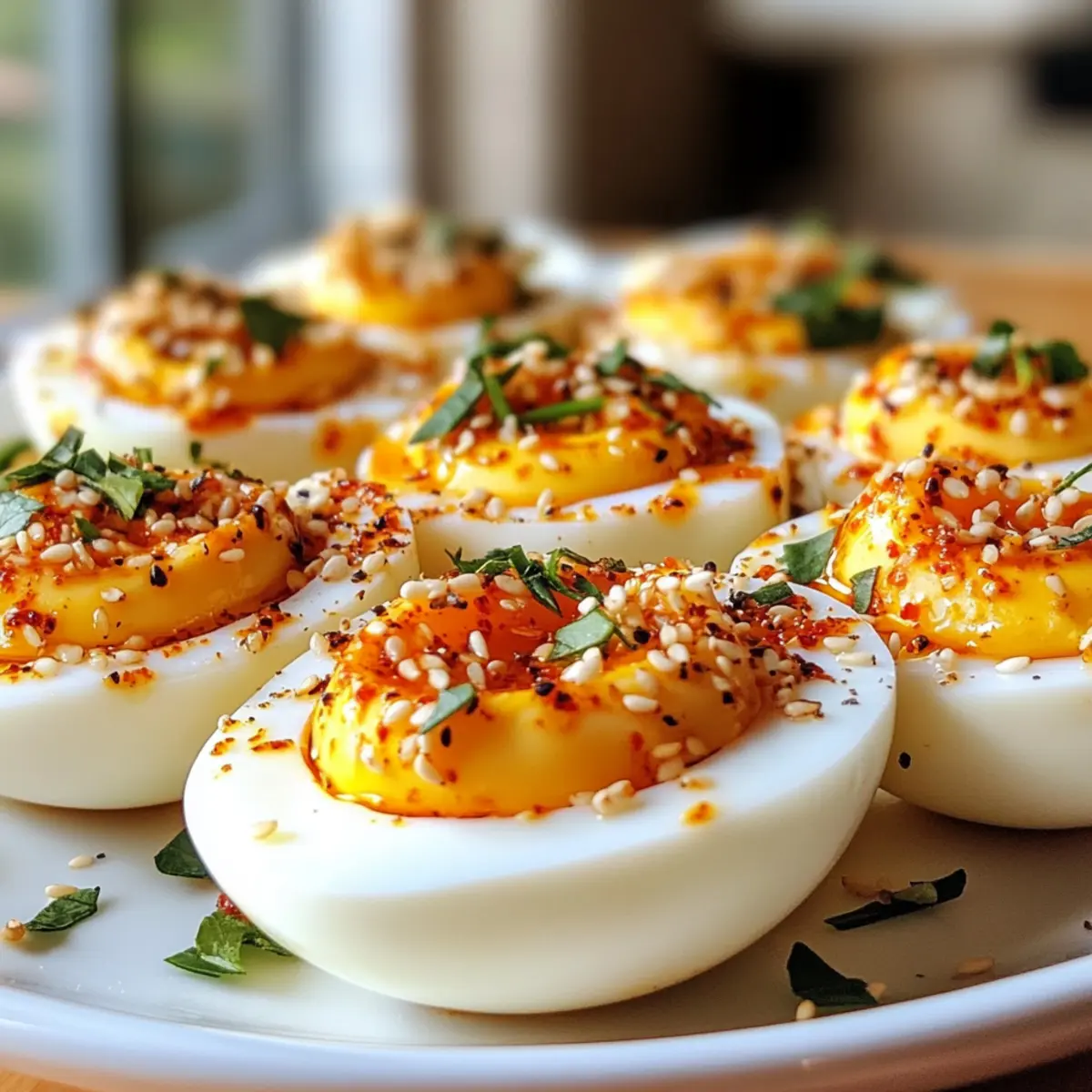Bold flavors: These Spicy Chili Garlic Deviled Eggs redefine the traditional recipe with an electrifying twist that bursts with heat and umami in every bite.