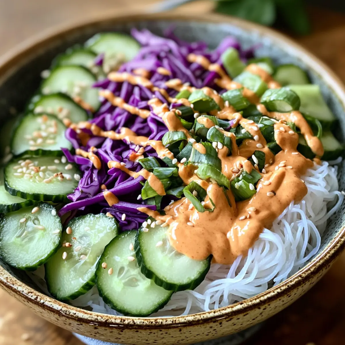 - Combine Ingredients: In the bowl with the cooled noodles, add sliced cucumber, purple cabbage, grated carrot, and red bell pepper. Toss in chopped cilantro and mint until well-distributed.