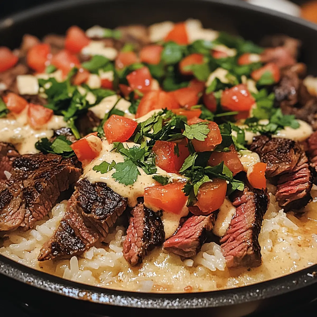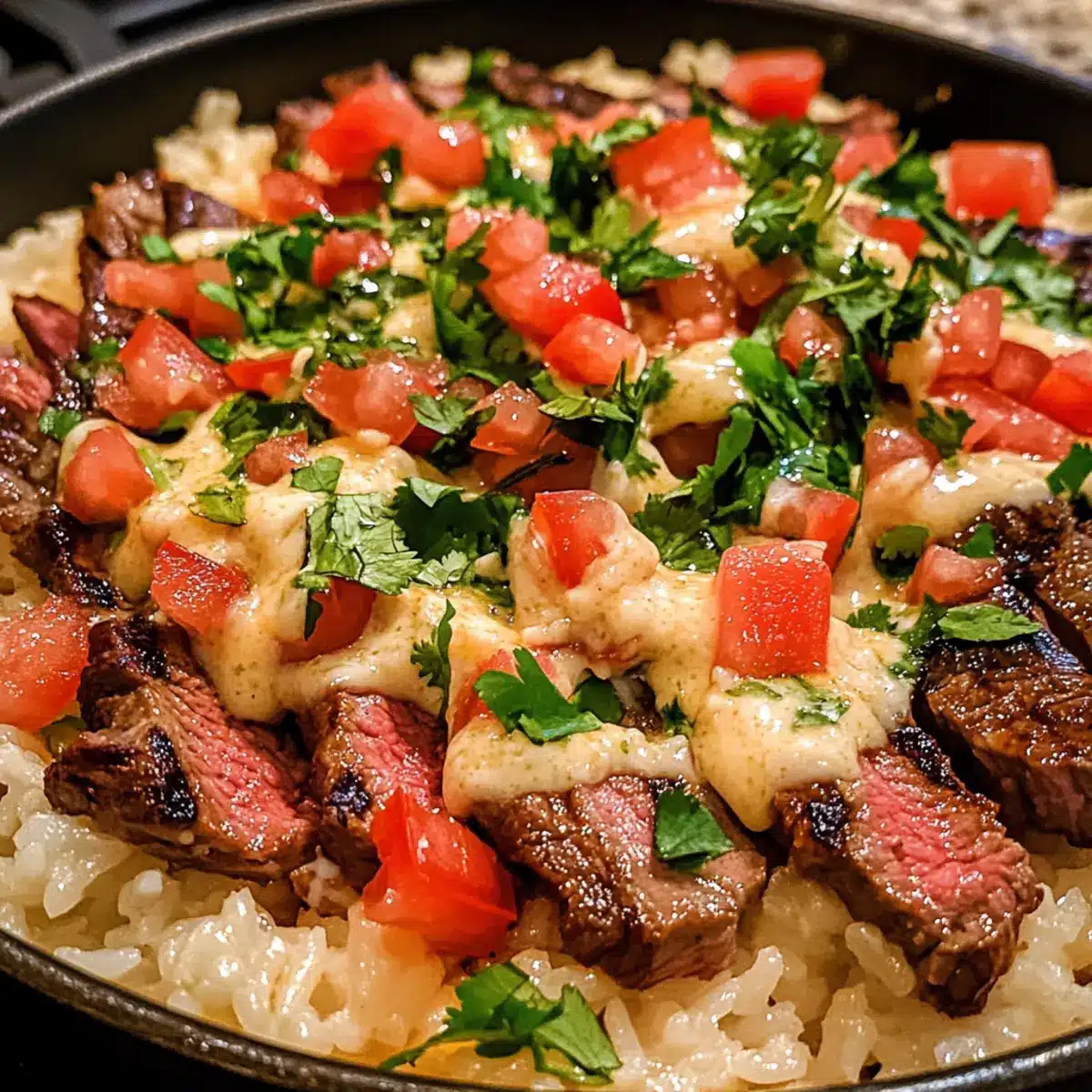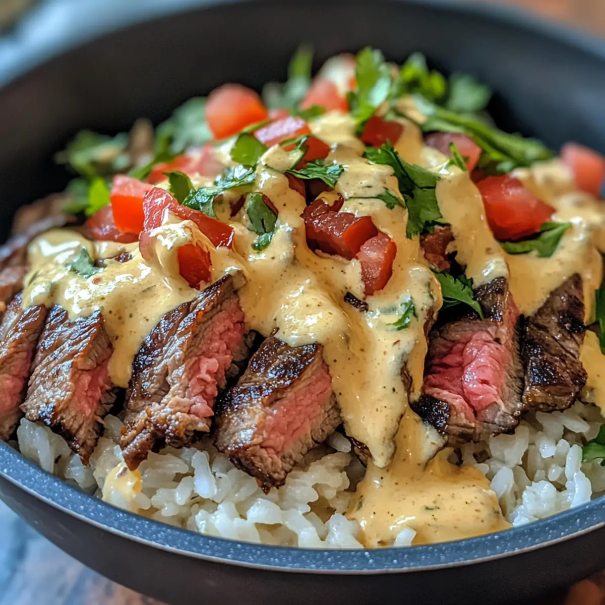 - Divide rice into serving bowls, top with steak strips, and drizzle with queso sauce. Add optional toppings like cilantro, tomatoes, jalapeños, or sour cream.