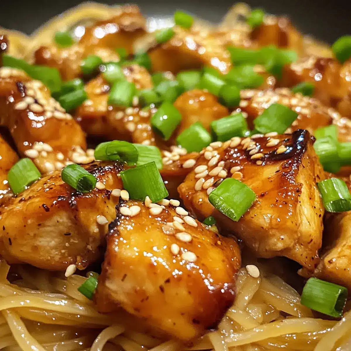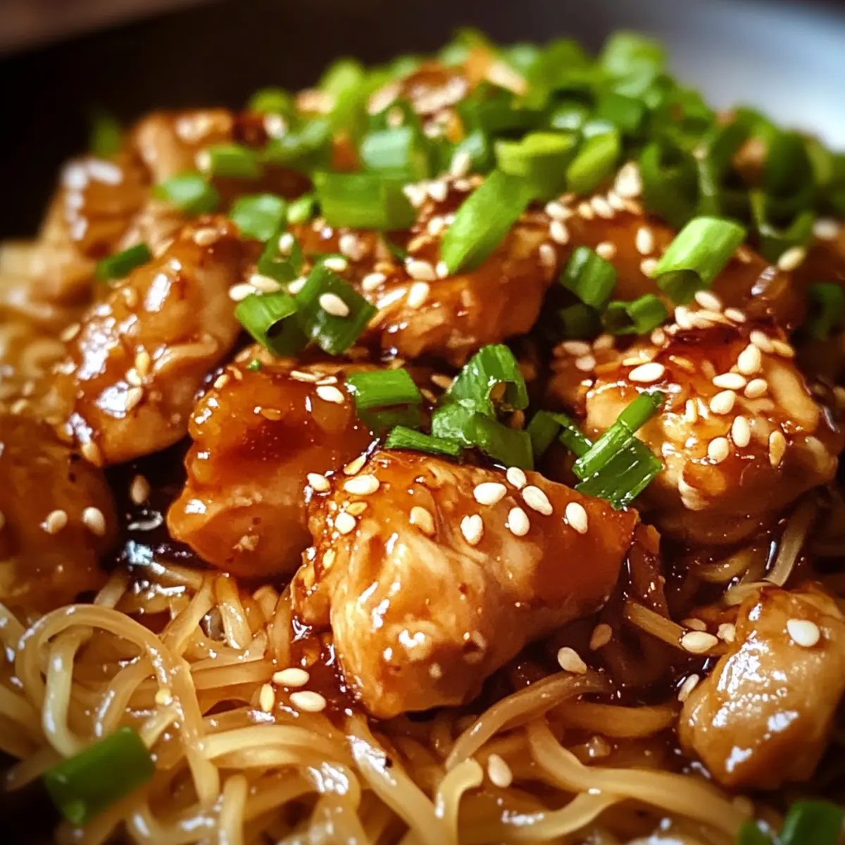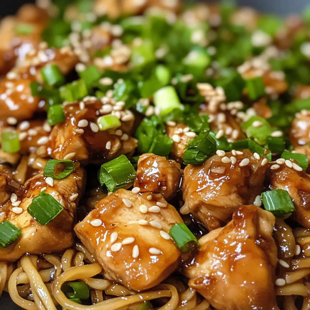 Garnish with Care: Adding green onions and sesame seeds just before serving not only elevates the dish’s presentation but also adds freshness and crunch to your Sticky Garlic Chicken Noodles.