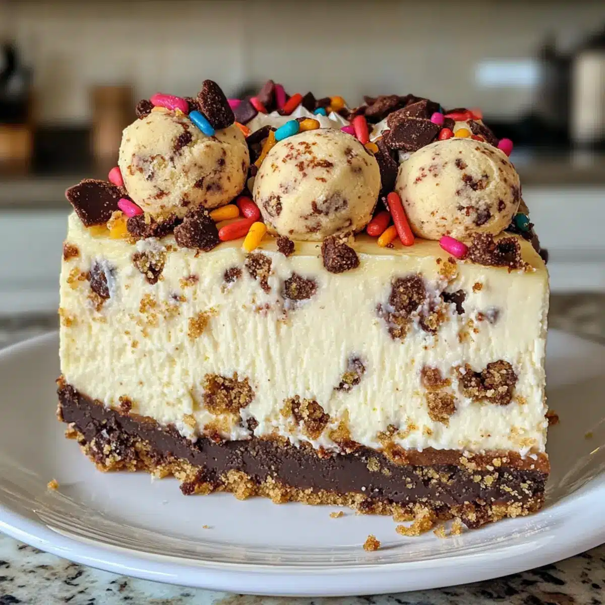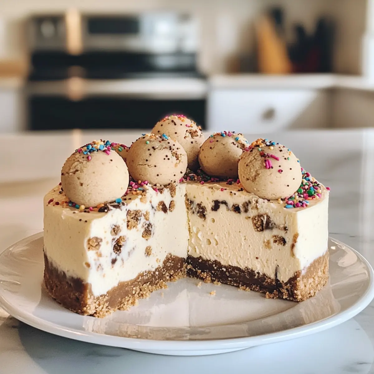 - Once chilled, pour ganache over the cheesecake, spreading evenly. Garnish with additional cookie dough balls and Christmas sprinkles.
